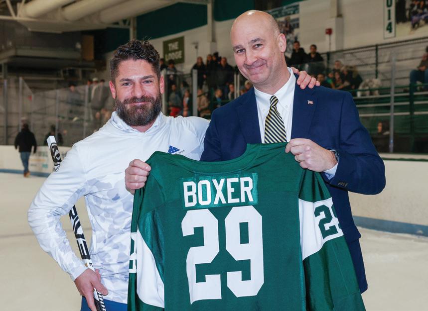 A goalie on the men’s ice hockey team during his time at Babson, Greg Boxer ’07 credits coach Jamie Rice ’90 with instilling the mindset and work ethic that shaped his life trajectory ever since. This year, he established an endowed gift to name the Boxer-Rice Head Men’s Ice Hockey Coach position in perpetuity.