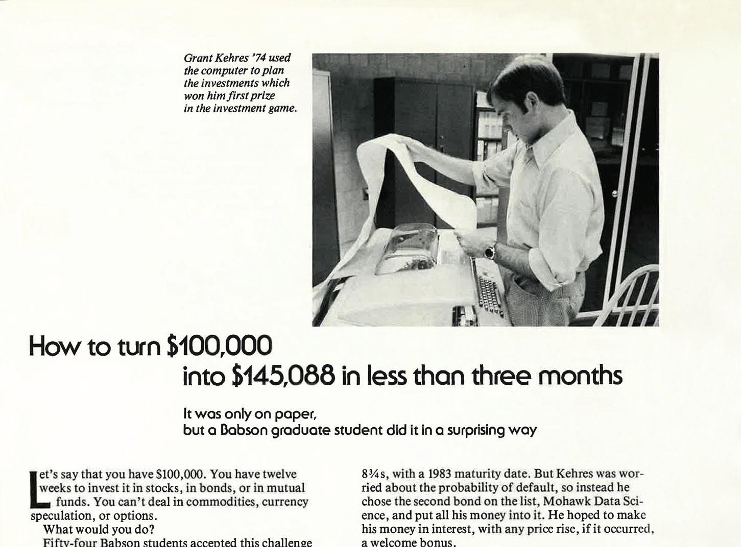 Grant aims to be actively engaged with each Kehres Scholar—a partnership that will make his contribution unique among estate gifts. One of his goals while alive is to pass on to each Scholar the benefits of his years of active securities selection and portfolio management success. “One of the hardest things is not knowing when to buy, but when to sell,” he explains. “This is something that was not discussed back in my Babson days. It’s quite the art. I’m hoping to have an opportunity to have a one-on-one with some of the Kehres Scholars to say, here’s what I’ve learned. Put this to good use.”