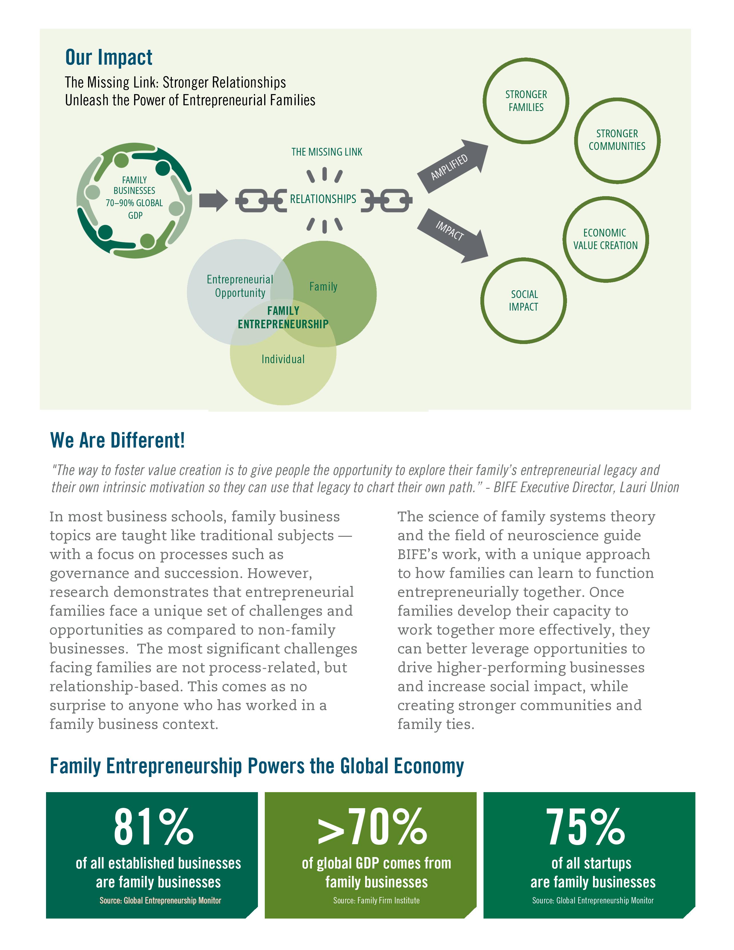 We believe entrepreneurial families are the greatest force for growth and positive change on the planet. Our mission is to amplify the capacity of these families to create better businesses, communities, and societies through stronger family relationships.