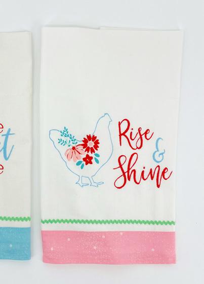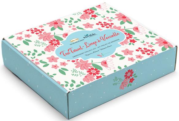 RILEY BLAKEEMBROIDERED TEA TOWEL PROJECT KIT Includes 4 embroidery designs, project instructions, 2 blank cotton towels, fabric,trim, Bev McCullough stiletto, 4 Madeira polyneon