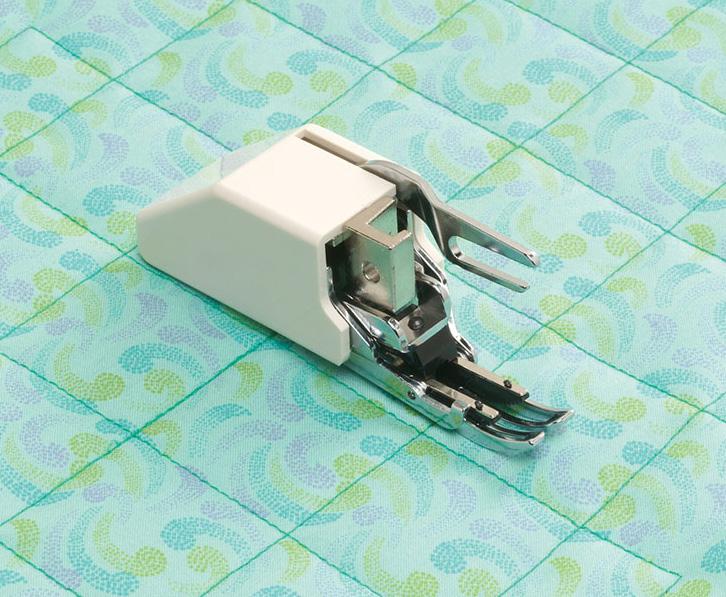 This exclusive foot includes feed dogs that control and guide multiple layers evenly. It includes three interchangeable soles, a standard sole, open toe sole and stitch-in-the-ditch sole, as well as two quilting bars to guide your top-stitching in either direction. For high-shank machines attach the adapter (included with the machine) to the presser bar first.
