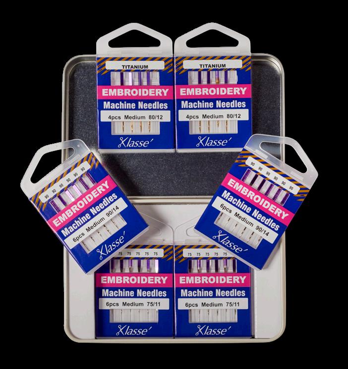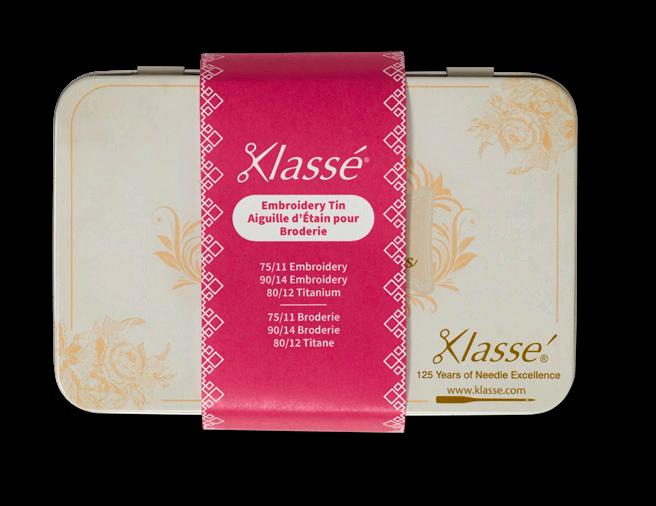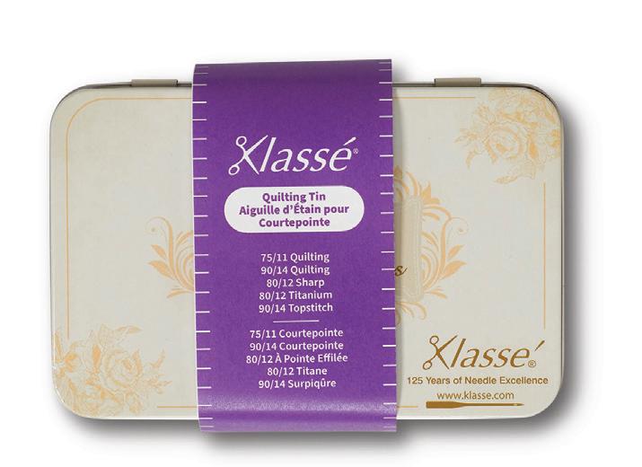 Includes the following Klassé needle cassettes: Quilting 75/11, Quilting 90/14, Titanium Quilting 80/12, Topstitch 90/14, Sharp 80/12. Also includes QR code to instructional video.