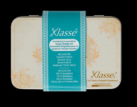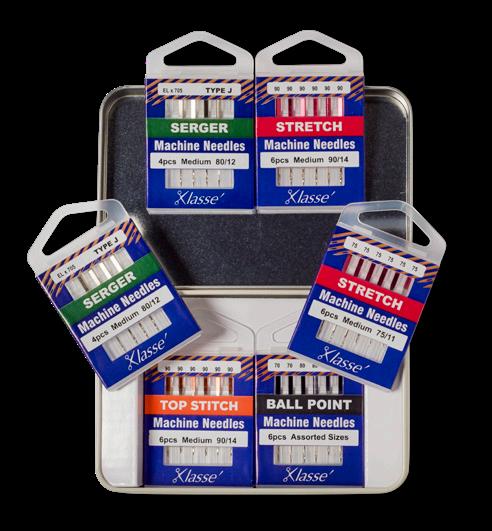 Includes the following Klassé needle cassettes: Serger EL705 80/12, Topstitch 90/14, Stretch 75/11, Stretch 90/14, and Ballpoint Needle Assort 70/10, 80/12, 90/14. Also includes QR code to instructional video.