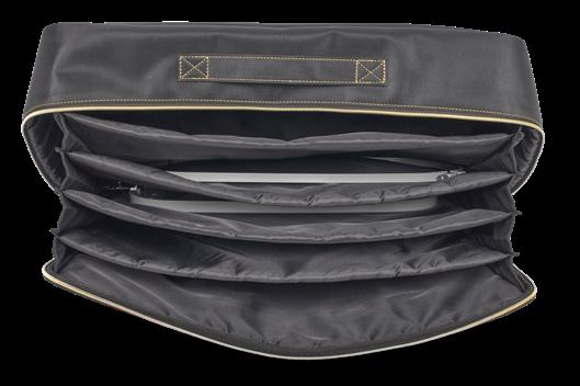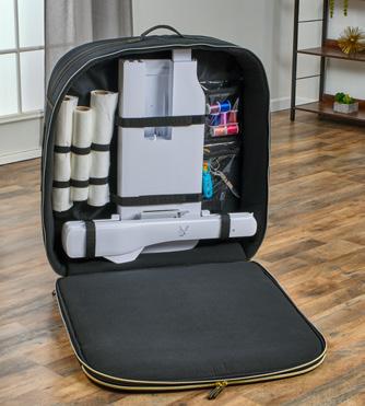 Includes outer pocket and zipper pocket for largest Radiance Hoop (28-1/2in H x 18-1/4in W), inside includes straps to secure embroidery unit and arm, elastic bands to hold stabilizer rolls, inner clear pockets for sewing notions, and outer handles for easy handling and XL Quilted Trolley with gold components.