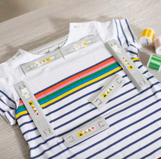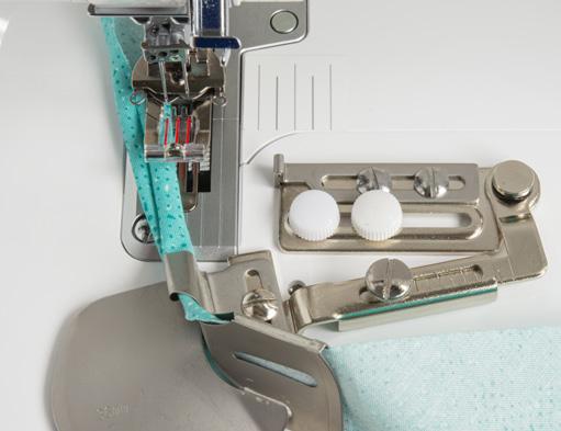 If precise stitching lines are what you desire, attach the adjustable fabric guide to the table of your serger. The guide helps you align your fabric for perfect chain and coverstitching every time.