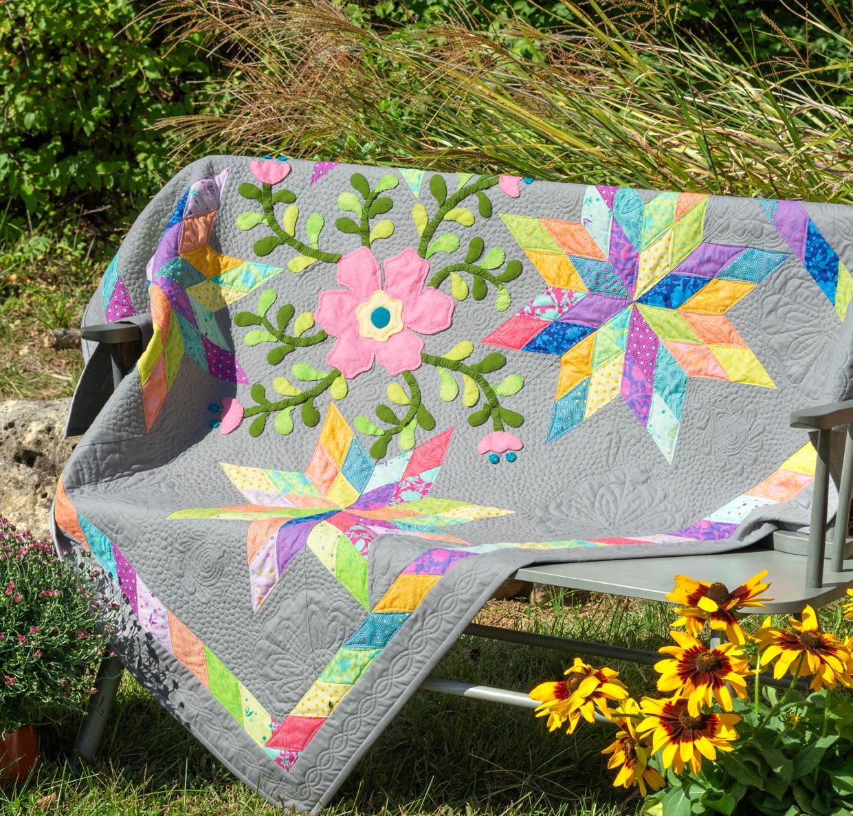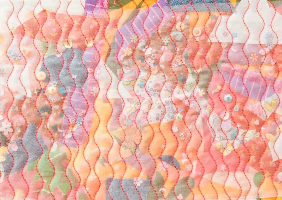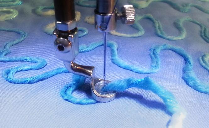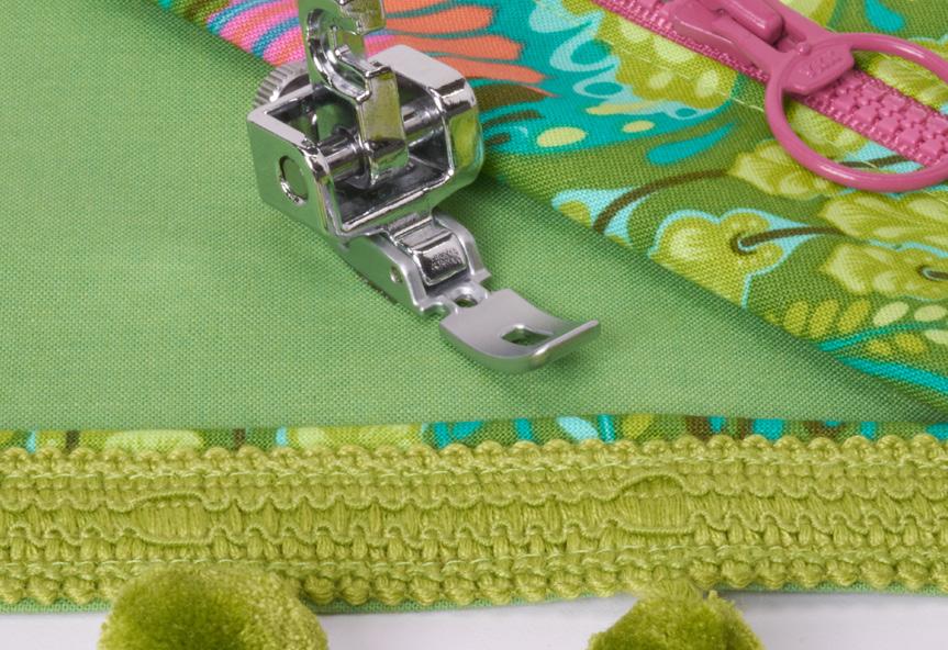This foot easily glides around appliqué, embroidery designs, rickrack, lace, embellishments or other dimensional elements on a quilt.