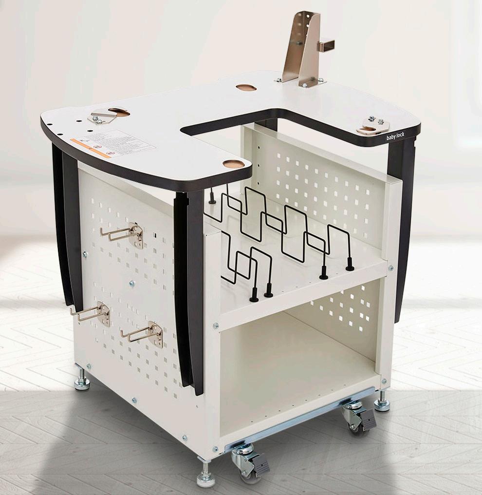 Support your embroidery machine with this sturdy stand, designed for organization. It stores all of your embroidery accessories, has wheels for mobility and can be adjusted to multiple heights.