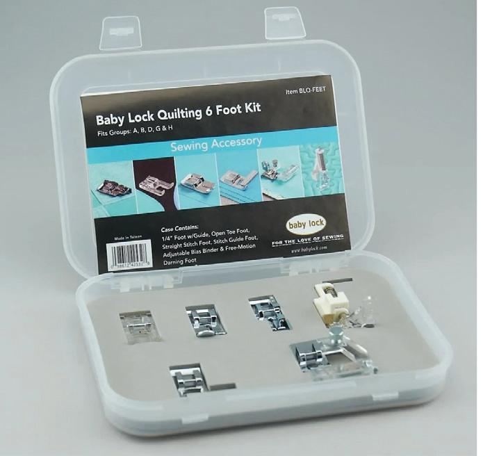 This foot kit will help you get the most out of your Baby Lock quilting machine. It comes with six feet in a handy see-through case.