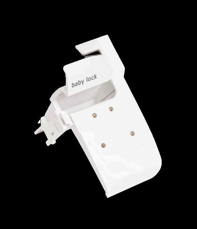 This adjustable guide acts as a platform for many of the Baby Lock serger attachments when it is secured to the swing guide. In position, simply swing the guide away from the machine to easily position the fabric in the attachment. Move the swing guide toward the machine and the attachment and align it with the needle.