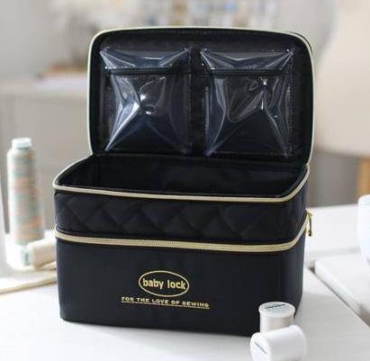 Quilted Black with Gold Logo & Components. Includes space for all of your notions in a chic 2 tiered quilted organizer with 2 clear zipper pockets and an inner elastic pocket to keep sewing tools in place. Bottom portion has a long clear zipper pocket and 15 individual spaces