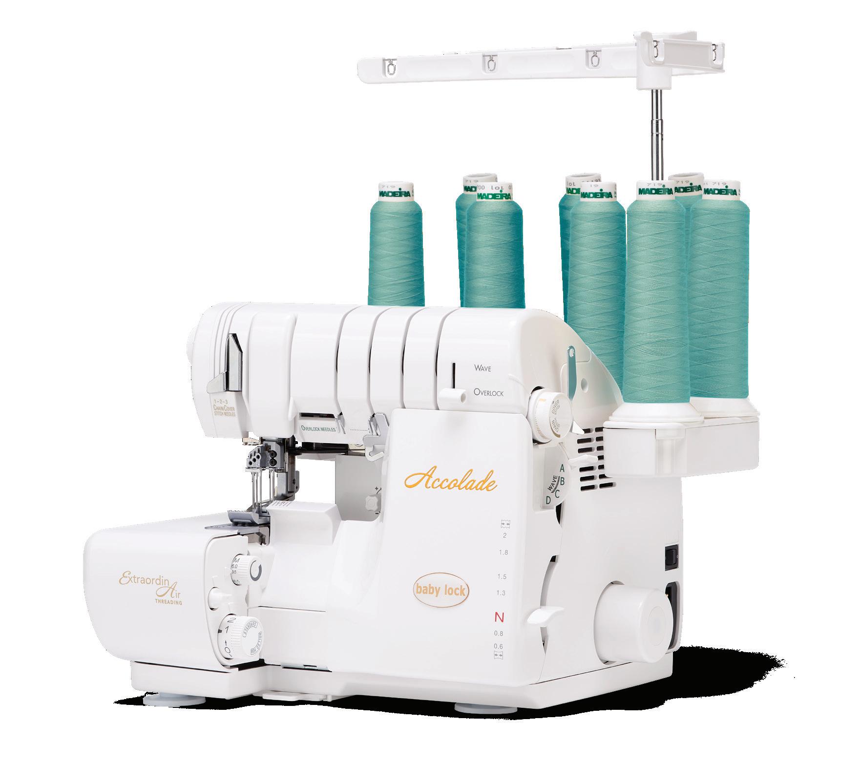 Bring a new sense of creative capability to your serging with the Baby Lock Accolade. Combine chain and overlock stitches to form stitches with up to eight threads. ExtraordinAir® threading takes your thread through all three loopers at once, instantly, with a gust of air. Plus, Accolade’s presser foot features a 6mm height that makes serging on thicker fabrics a breeze!