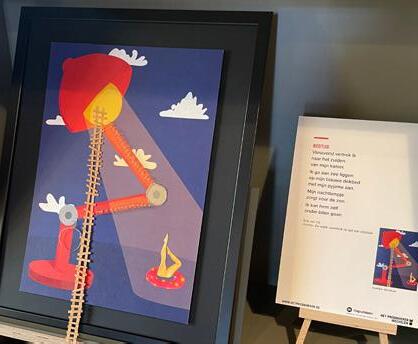 Naar aanleiding van de poëzieweek met als thema 'thuis' maakten leerlingen poëtische juweeltjes die ze rondbrachten in de buurt van de school. Onze kunstleerlingen maakten er bijpassende digitale collages en linodrukken bij die werden verkocht tijdens de infomomenten in maart en mei.