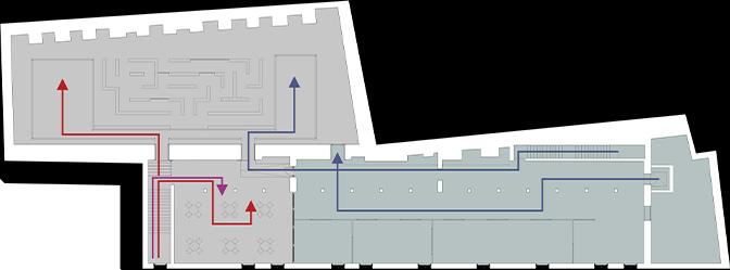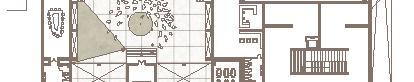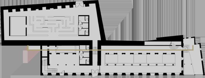 Il piano terra è stato diviso in due parti, quali il museo, sulla destra, che è stato mantenuto nel suo stato originale, ad eccezione del pavimento, messo in sicurezza. Tuttavia, alcune parti sono state lasciate a vista, in modo da poterle osservare. L’altra parte ospita una biblioteca, disposta su due livelli.