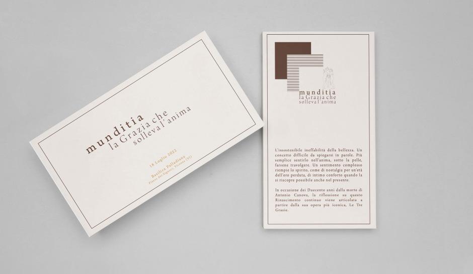 In occasione del 200° anniversario della morte di Canova, siamo stati incaricati di organizzare una mostra con un titolo comune a tutti gli iscritti al corso: L’insostenibile ineffabilità della Bellezza. Abbiamo poi declinato la mostra in base alla collezione selezionata, generando così il titolo Munditia. A ciascuna delle grazie è dedicata una sala della Basilica Palladiana di Vicenza; un ambiente all’interno del quale i capolavori dello scultore dialogano con forme d’arte contemporanea, che ora li introducono, ora li accompagnano, talvolta li esaltano. Come cerchi concentrici che nascono da una goccia caduta nell’acqua, la Grazia si perpetua in questo palinsesto: impalpabile, impossibile da descrivere, ma anche così chiara e avvolgente.