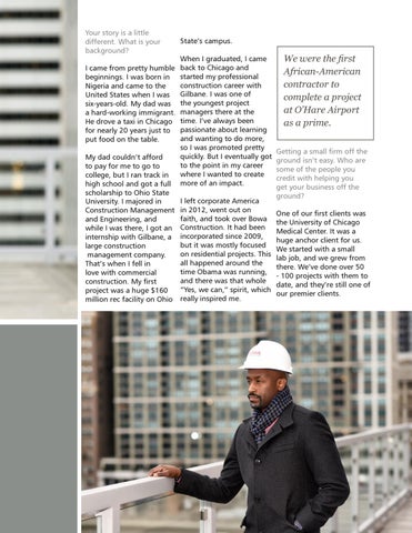 When I graduated, I came I came from pretty humble back to Chicago and beginnings. I was born in started my professional construction career with Nigeria and came to the United States when I was Gilbane. I was one of six-years-old. My dad was the youngest project a hard-working immigrant. managers there at the He drove a taxi in Chicago time. I’ve always been for nearly 20 years just to passionate about learning and wanting to do more, put food on the table. so I was promoted pretty quickly. But I eventually got My dad couldn’t afford to the point in my career to pay for me to go to where I wanted to create college, but I ran track in high school and got a full more of an impact. scholarship to Ohio State I left corporate America University. I majored in Construction Management in 2012, went out on faith, and took over Bowa and Engineering, and while I was there, I got an Construction. It had been internship with Gilbane, a incorporated since 2009, but it was mostly focused large construction on residential projects. This management company. all happened around the That’s when I fell in time Obama was running, love with commercial and there was that whole construction. My first “Yes, we can,” spirit, which project was a huge $160 million rec facility on Ohio really inspired me.
