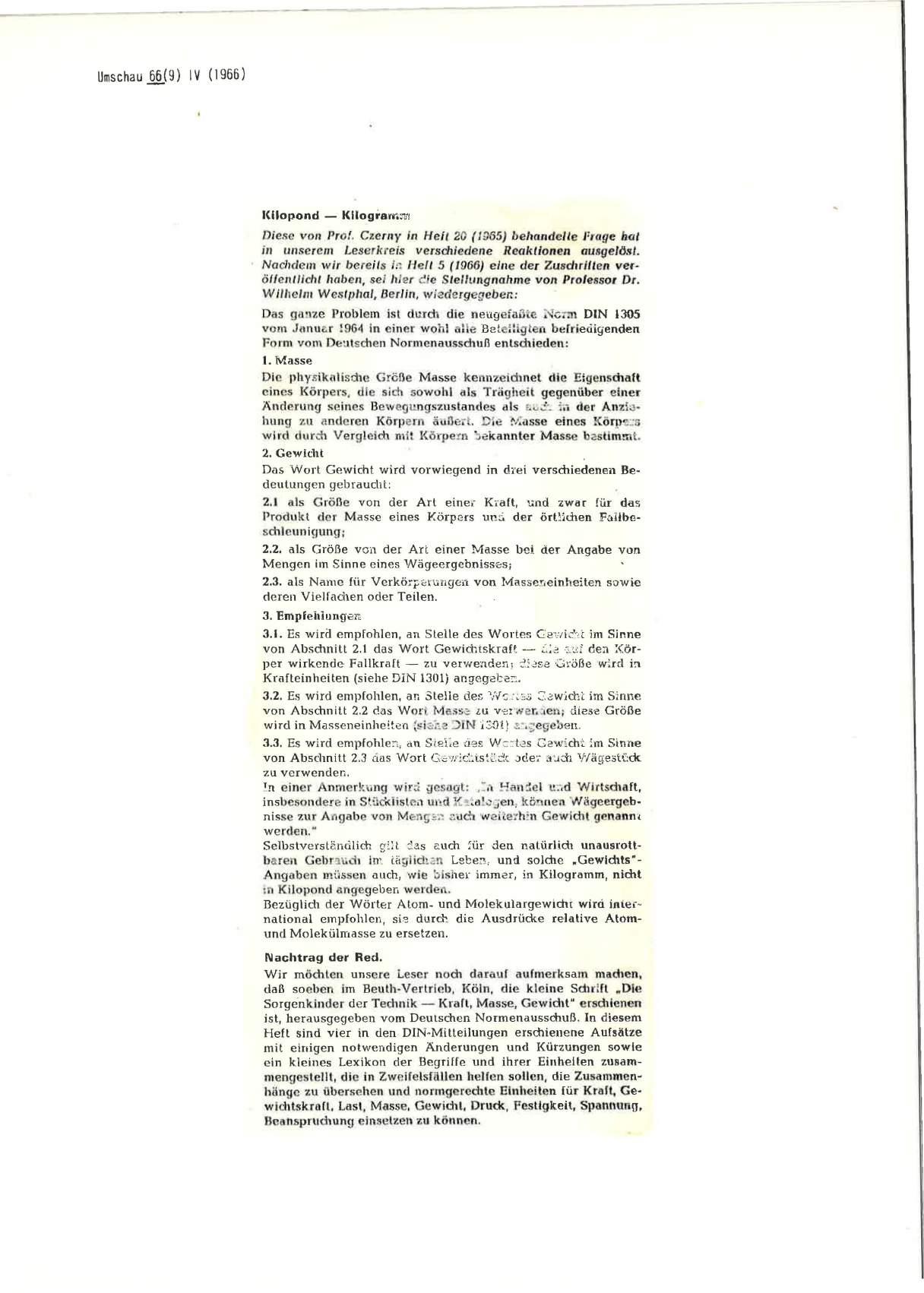 Hier taucht also der Gedanke des Naturmasses in einer neuen, geläuterten Form wieder auf, Er ist heute für die :\lasse durch 'Nahl des Kohlenstoffisotops 12 C als Einheit, für das Zeitmass durch die Atomuhren und für die Längeneinheit durch die neue optische Meterdefinition Wirklichkeit geworden.