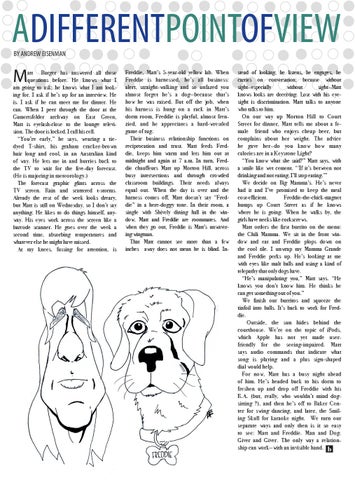 stead of looking, he listens, he engages, he carries on conversation; because without sight—especially without sight—Matt knows looks are deceiving. Lost with his eyesight is discrimination. Matt talks to anyone who talks to him. On our way up Morton Hill to Court Street for dinner, Matt tells me about a female friend who enjoys cheap beer, but complains about her weight. The advice he gave her—do you know how many calories are in a Keystone Light? “You know what she said?” Matt says, with a smile like wet cement. “‘If it’s between not drinking and not eating, I’ll stop eating.’” We decide on Big Mamma’s. He’s never had it and I’ve promised to keep the meal cost-efficient. Freddie-the-chick-magnet humps up Court Street as if he knows where he is going. When he walks by, the girls have necks like corkscrews. Matt orders the first burrito on the menu: the Chili Mamma. We sit in the front window and eat and Freddie plops down on the cool tile. I unwrap my Mamma Grande and Freddie perks up. He’s looking at me with eyes like malt balls and using a kind of telepathy that only dogs have. “He’s manipulating you,” Matt says. “He knows you don’t know him. He thinks he can get something out of you.” We finish our burritos and squeeze the tinfoil into balls. It’s back to work for Freddie. Outside, the sun hides behind the courthouse. We’re on the topic of iPods, which Apple has not yet made userfriendly for the seeing-impaired. Matt says audio commands that indicate what song is playing and a plus sign-shaped dial would help. For now, Matt has a busy night ahead of him. He’s headed back to his dorm to freshen up and drop off Freddie with his R.A. (but, really, who wouldn’t mind dogsitting ?), and then he’s off to Baker Center for swing dancing, and later, the Smiling Skull for karaoke night. We turn our separate ways and only then is it so easy to see: Matt and Freddie. Man and Dog. Giver and Giver. The only way a relationship can work—with an invisible hand.