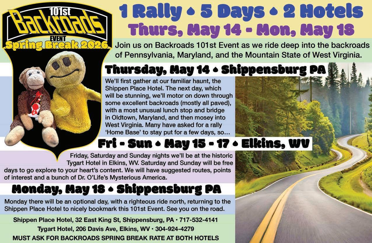 (ISSN 1087-2088) is published monthly by BACKROADS™, Inc. 2025. All rights reserved. BACKROADS™ may not be reproduced in any manner without specific written consent from the publisher. BACKROADS™ welcomes and encourages submissions (text and photos) and suggestions. Include phone number with submissions. BACKROADS™ will only return material with enclosed sufficient postage. The written articles and opinions printed in BACKROADS™ are not necessarily those of the publisher and should not be considered an endorsement. The Rip &Rides® published are ridden on the sole responsibility of the rider. BACKROADS™ is not responsible for the conditions of the public roadways traversed. Please respect the environment, read your owner’s manual and wear proper protective gear and helmet. Ride within your limits, not over them.