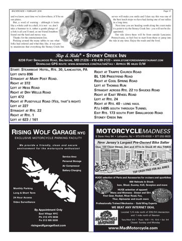 Rip & Ride® • STONEY CREEK INN 8238 FORT SMALLWOOD ROAD, BALTIMORE, MD 21226 • 410-439-3123 • WWW.STONEYCREEKINNRESTAURANT.COM DOWNLOAD GPS ROUTE: WWW.SENDSPACE.COM/FILE/GR21AU • APPROX 95 MILES O/W