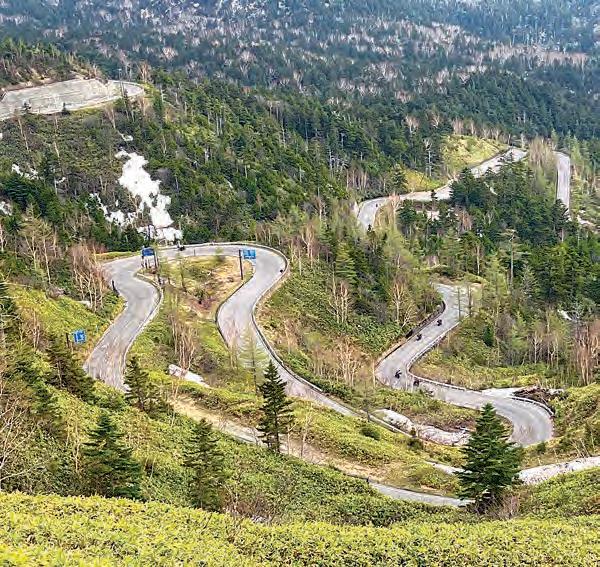 Everybody loved the snow monkeys, but we had miles to cover and were going to ride over Mount Norikura, at 8,865 feet, the highest roadway in Japan. The locals called it the Echo Line, I call it fantastic. Truly amazing, and breathtaking, as we rode higher and higher, tree lines fading to be replaced by snow that was still many feet deep, even in late May. It was a spirited ride, and we stopped at the summit for a photo op, and then headed down, in that same sporty fashion.