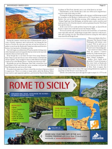 Page 21 Academy at West Point, that this area is one of the finest in our land. Unfortunately, on any Sunday, this is also one of the most congested motorcycle roads in the nation as well. Crossing the bridge and bearing right on the sweepy road that wraps around the mountain on the Hudson’s eastern-side on US 6 most times is a ride in futility –but, not on this Monday morning. After making a quick pass of ‘Granny Tight Lips’ from Michigan, we had the entire road to ourselves and made good use of it. Benedict Arnold could not getaway from the West Point area quicker than us. At the circle we bore north and then leaned to the right, on Sprout Brook Road, to explore the roads that led into the Putnam Valley. We do not ride this region nearly as much as we would like, so I made this route especially intricate, swallowing as many little connector roads as possible and crossing over the West Branch Reservoir along the well named stone-lined Rock Bridge Road. When most think of the Revolutionary War General George Washington will always come to mind. Well, he will join us later in this story but, right now, we had a more fascinating tale. Just outside of Carmel, New York we passed a historic marker for a little known heroine of our Revolutionary War – Sybil “Sibbell” Ludington. Author Steve Smith wrote about this 17 year old woman a few years back in Backroads and it was nice to see the state of New York recognize this young woman whose ride to warn of the approaching British was equally as important as Paul Revere’s more famous ride. Sibbell rode nearly forty miles through the night on April 26, 1777 to tell