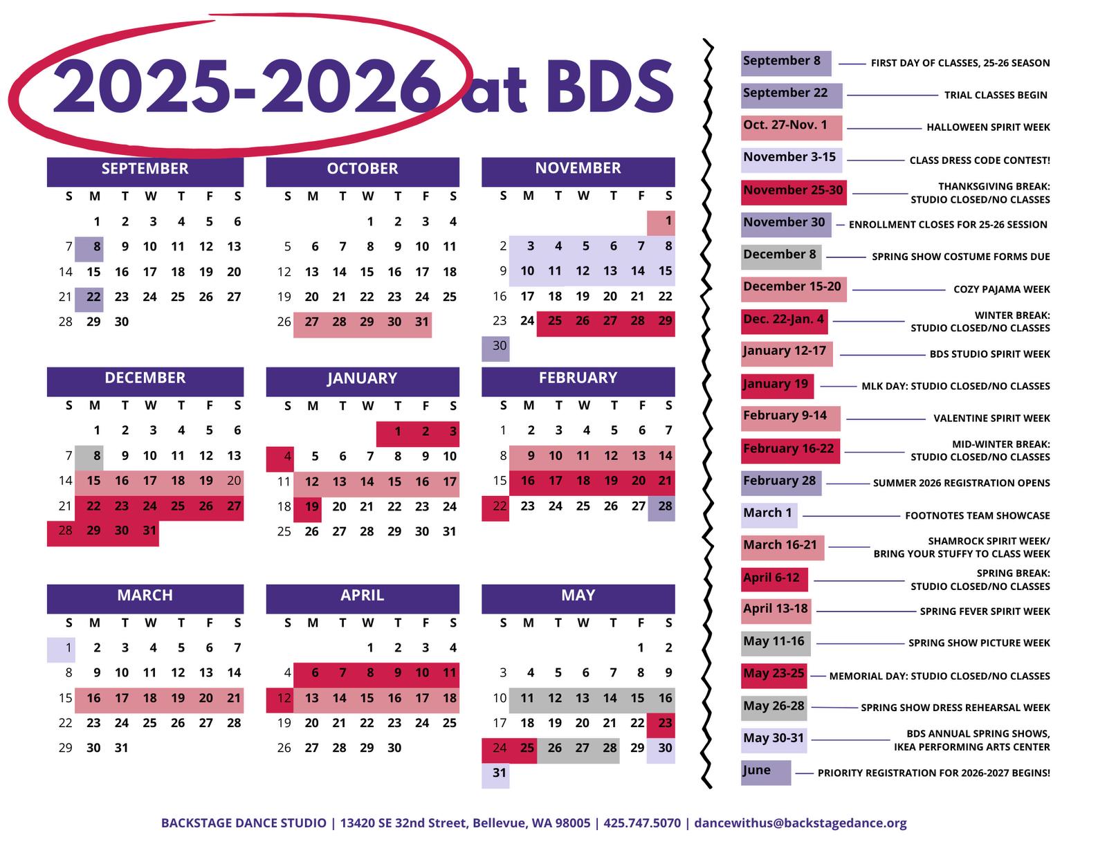 Backstage follows the Bellevue Schoo calendar and we match our dance cla with many of the school district break longest break takes place in Decembe studio will be closed for classes Decem through January 4th. Make-up class o end before winter break, so if your chi make up a missed class, make sure th before the end of December!