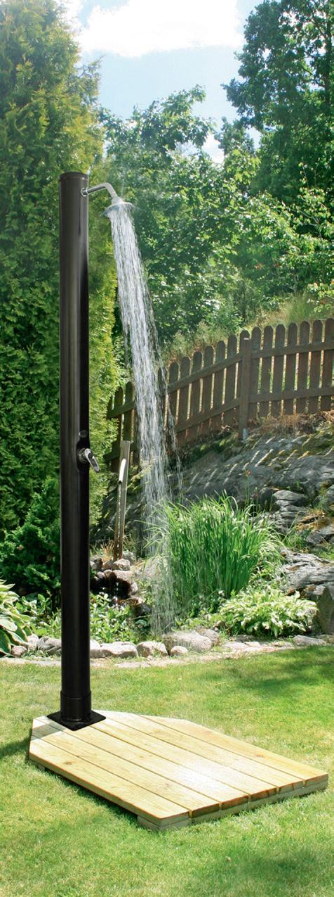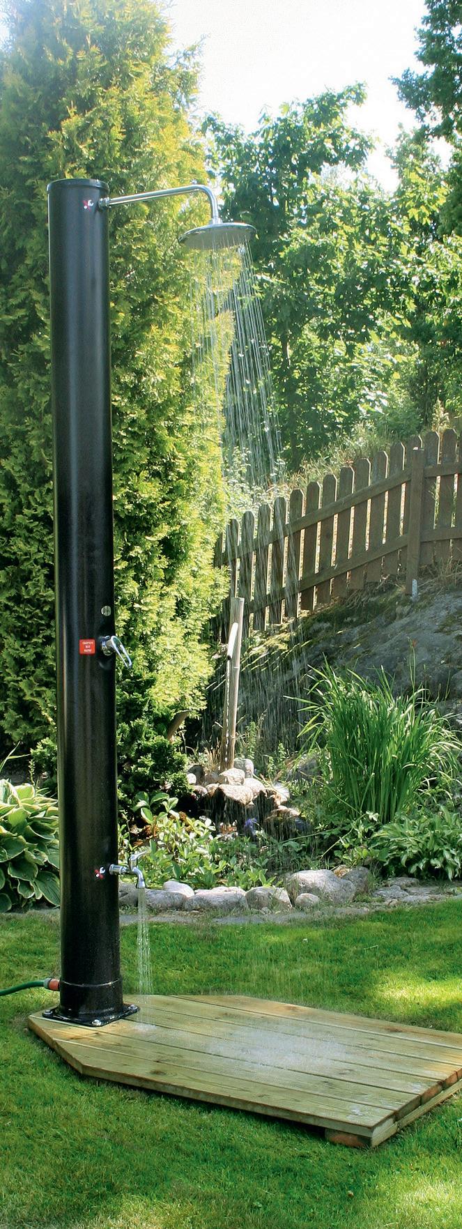 Demerx Sunny 40 Utomhusdusch med soluppvÀrmd varmvattenberedare som rymmer 40 liter. Ger ca 20 min skön tempererad duschning. Med praktisk fotdusch/vattenutkastare (kallt vatten) Ansluts lÀtt till trÀdgÄrdsslangens snabbkoppling.