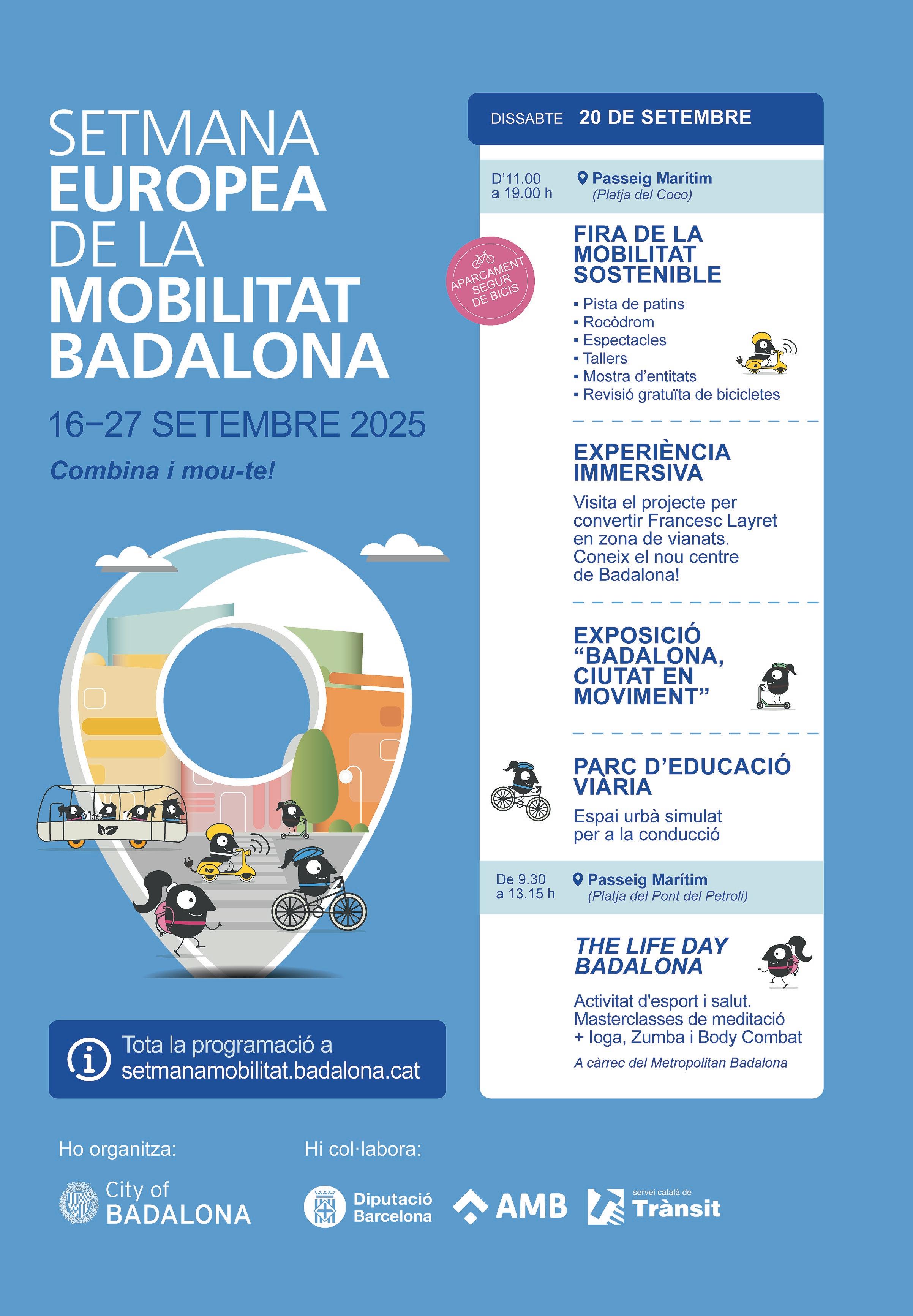 adalona celebra la Setmana Europea de la Mobilitat amb un programa d'activitats, que van començar dimarts i s'allargaran fins al dia 27. En ella els veïns podran conèixer amb profunditat la transformació urbanística que s'està executant a la ciutat per tal d'afavorir la mobilitat sostenible i la cohesió territorial. La principal novetat d'enguany serà la Fira de la Mobilitat, que es farà demà dissabte al passeig marítim i el seu entorn entre les 11 i les 19 hores. A la fira hi haurà activitats com una experiència immersiva amb ulleres 3D sota el títol "Coneix el nou centre de Badalona", una proposta per acostar a la ciutadania el projecte de reurbanització del carrer Francesc Layret; l'exposició "Badalona, ciutat en moviment" sobre l'evolució de la ciutat a través del transport, activitat que es farà davant de la CACI; hi haurà una pista de patinatge en línia, rocòdrom i passeig en tricicles per a persones grans (en bici sense edat); un parc d'educació viària per als més petits a càrrec del Servei Català de Trànsit i activitats d'empreses i serveis vinculats al sector de la moblitat per part de Direxis, Tram, TMB, AMB i la Diputació de Barcelona. Durant demà al matí els veïns també podran participar al passeig marítim, a l'altura de la platja del Pont del Petroli, en l'activitat "The life day Badalona, una proposta d'esport i salut", que consistirà en classes de meditació i ioga, zumba i "body comtact", activitat que anirà a càrrec del Metropolitan Badalona. Durant la Setmana de la Mobilitat també s'està fent una activitat relacionada amb aquesta temàtica a les bilbioteques de la ciutat, on els infants gaudeixen a L'Hora del Conte del conte A pas de zebra, del Col·lectiu Peste Alta. Finalment, el dissabte dia 27 es farà una jornada de portes obertes a la ciutadania a la cotxera d'autobusos, amb la voluntat de reivindicar l'ús del transport públic. Per participar en la visita cal inscriure's prèviament durant la Fira de la Mobilitat. Es pot consultar tota la informació de la Setmana de la Mobilitat a setmanamobilitat.badalona.cat.