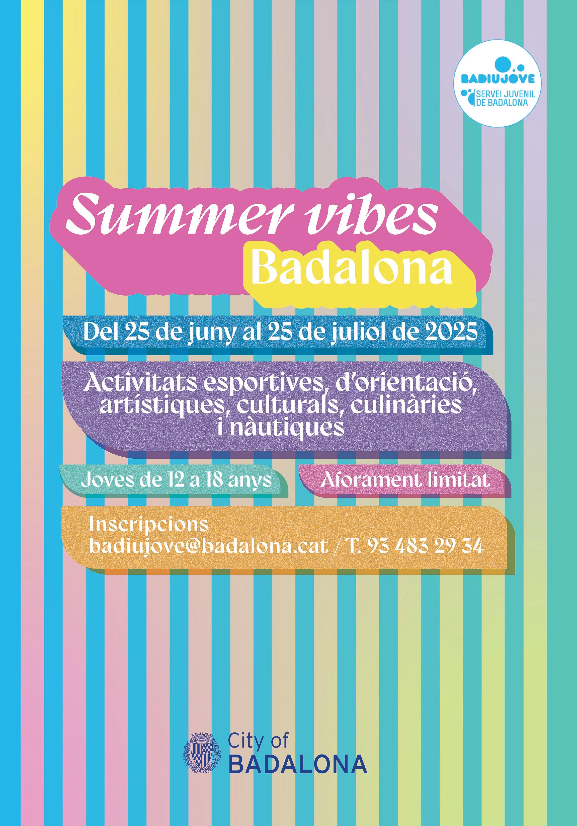 L'Ajuntament, mitjançant el Servei Juvenil i municipal, impulsa el Summer Vibes Badalona, una proposta d'activitats d'estiu que té l'objectiu d'oferir alternatives d'oci saludables i creatives per al jovent, amb activitats pensades per connectar, descobrir i gaudir de la ciutat. Aquesta programació permet que els i les joves d'entre 12 i 18 anys gaudeixin de tardes plenes d'activitat, creativitat i bon ambient. Des del passat dimecres, dia 25 de juny, fins al 25 de juliol, cada tarda de dilluns a divendres l'Ajuntament ofereix una gran varietat de propostes gratuïtes que es desenvoluparan en múlti-
