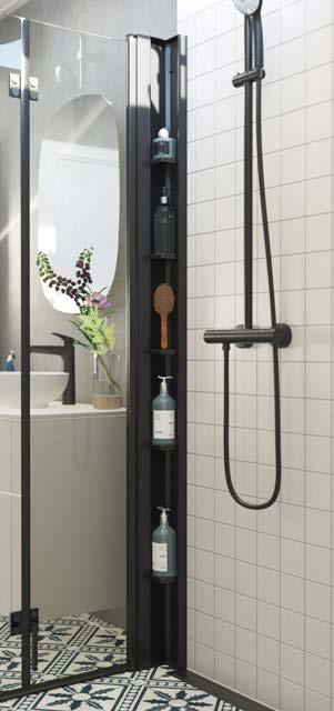 Med Tower-hjørnehyllen, som er en integrert del av Match-serien, blir det oppbevaringsplass til sjampo, såpe og alt det andre du trenger i dusjen. Tower leveres både i sort matt og sateng.