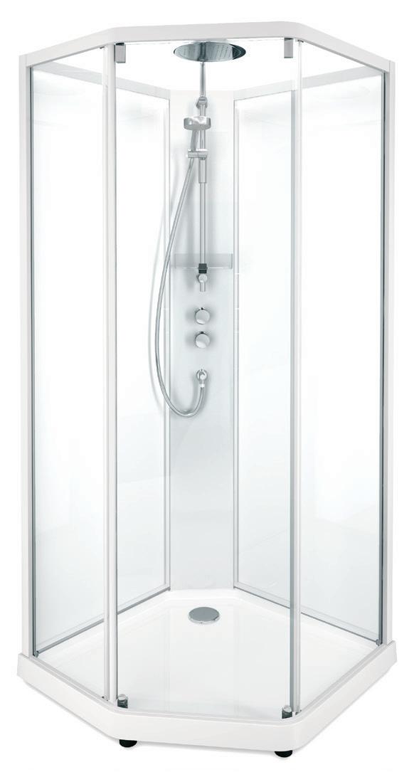 Toppmodell, komplett med dusjkar i kunstmarmor, integrert blandebatteri, dusjsett med takdusj og regulerbar hånddusj. Enkel rengjøring med hjul under. Størrelse: 90x90x215 cm. 22816 ,-
