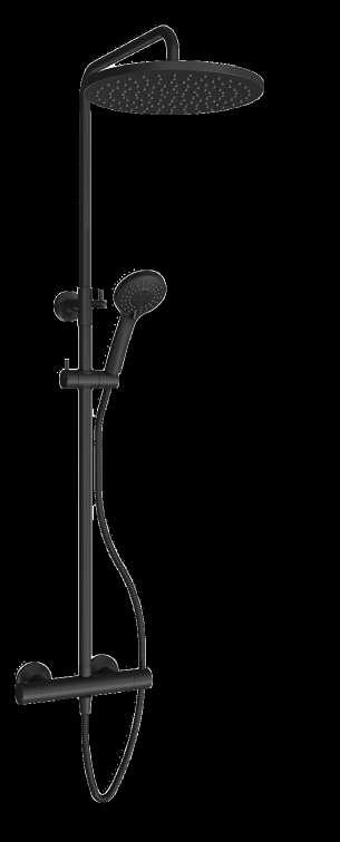 Komplett takdusjsett i sort matt med termostatkran og hånddusj. Regulerbar høyde. 6.995 ,Optima bad Termostatkran med safe-touch og skåldesperre. 2.766,-