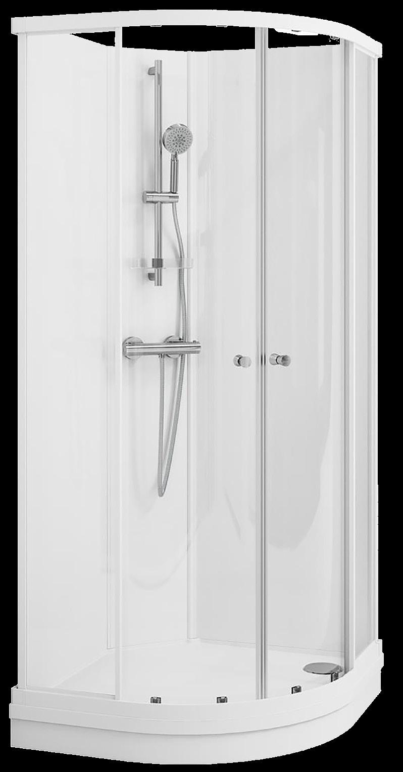 Lekkert og utrolig solid dusjkabinett med praktiske hyller i hjørnet. Meget enkel montering og lett å holde ren.