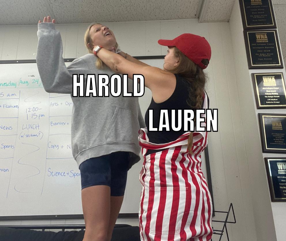 CAROLINE CROWLEY. THE BADGER HERALD. That moment when Lauren was fed up with Harold’s Wordle suggestions. #Laurenneedsangermanagementclasses. AUDREY THIBERT. THE BADGER HERALD. NYT could do literally any other five letter word. Okay, maybe not ANY other five letter word, but you get it. CAROLINE CROWLEY. THE BADGER HERALD. The New York Times burns after Wordle gets set as “GULLY.” A true tragedy. This is all Lauren — and the millions in the crowd that day — have to say to Harold. AUDREY THIBERT. THE BADGER HERALD. 22 • badgerherald.com •.September 13, 2022 BANTER @badgerherald