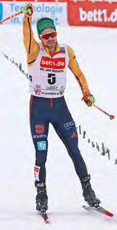 …ist es natürlich gut, dass man durch das Laufen noch Plätze gut machen kann. Letztendlich ist das Springen ja auch nur eine Momentaufnah me und da kann der eine einzige Wertungssprung schon mal da neben gehen. Durch das Lau fen hat man dann aber doch noch die Möglichkeit, die Ge samtplatzierung zu verbes sern. Auch das liebe ich an der Nordischen Kombination. Generell ist die „NoKo“ meiner Meinung nach eine der span nendsten Sportarten. Selbst wenn die Ergebnisse nach dem Springen schon eindeutig erscheinen, ist noch so vieles möglich.