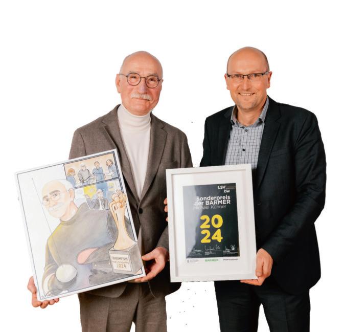 eine Fechthalle in der neuen Sporthalle in der Untertürkheimer Kurve eingeplant wurde. „Darauf bin ich besonders stolz“, sagt er. So kann beim PSV Stuttgart „fast unter profimäßigen Bedingungen“ trainiert werden. Die Halle ist Leistungsstützpunkt der Interessengemeinschaft Fechten Baden-Württemberg (IGF) und vom Deutschen Fechterbund als Bundes-Nachwuchsleistungszentrum zertifiziert. Neben dem maximal sportlichen Erfolg versucht Michael Kühner seinen Schützlingen aber auch Erlebnisse zu vermitteln, die ihnen in ihrem weiteren Lebensweg weiterhelfen. „Sie müssen lernen, mit Niederlagen umzugehen, aber auch bei einem Sieg auf dem Boden zu bleiben“, erklärt er, „Sport ist ein Geben und Nehmen.“ Deshalb teilt er seine Athletinnen und Athleten auch bei kleineren Turnieren als Kampfrichter ein. Weil der ehemalige Polizist sein Motto „verlange nie etwas, was Du nicht bereit bist, selbst zu bringen“ vorlebt, erlaubt er sich auch, seine Sportlerinnen und Sportler zu fordern. „Sie wissen, dass ich immer hinter ihnen stehe“, sagt er, der für alle, vom Neun- bis zum 80-Jährigen nur der Michi ist. Nur eines dürfe man nicht tun: „Demütigen darf man sie nicht.“ Neben der Liebe zum Fechten sei die „Familie des Sports“, wie Kühner seine Fechtabteilung bezeichnet, ein guter Ausgleich zu seinem Beruf als Kommissar bei der Sitte und Mordkommission gewesen, „bei dem ich nur das Schlechte gesehen habe“. Wie lange Michael Kühner noch auf der Planche stehen wird? Das Signal, wann der richtige Moment gekommen ist, sei, „wenn ich bei einem Turnier nicht mehr mitfiebere, mein Puls nicht mehr nach oben geht, dann ist mein Feuer erloschen“. Noch aber brennt die Flamme. Deshalb erhält Michael Kühner beim Trainerpreis BadenWürttemberg 2024 den Sonderpreis der BARMER. q Klaus-Eckhard Jost