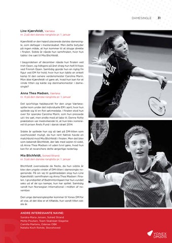 Mia Blichfeldt, SolrÞd Strand nr. 5 pÄ den danske rangliste pr. 1. januar Blichfeldt overraskede de fleste, da hun sidste Är blev den yngste vinder af DM-titlen i damesingle nogensinde. PÄ sin vej til guldmedaljen slog hun Line KjÊrsfeldt i semifinalen og Anna Thea Madsen i finalen. I grundspillet af Badmintonligaen har hun vundet seks ud af de syv kampe, hun har spillet. Samtidig vandt hun Norwegian International i midten af november. Den unge damesinglespiller kommer til Yonex DM for at vise, at det ikke er et tilfÊlde, hun vandt titlen sidste Är.