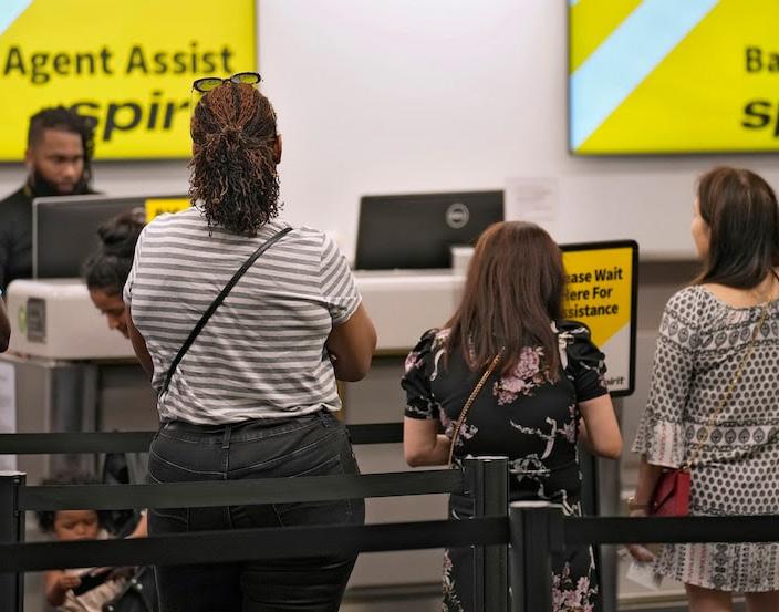 Passengers wait in a line for help at the Spirit Airlines ticket counter at the Tampa International Airport Thursday, June 1, 2023, in Tampa, Fla. (AP