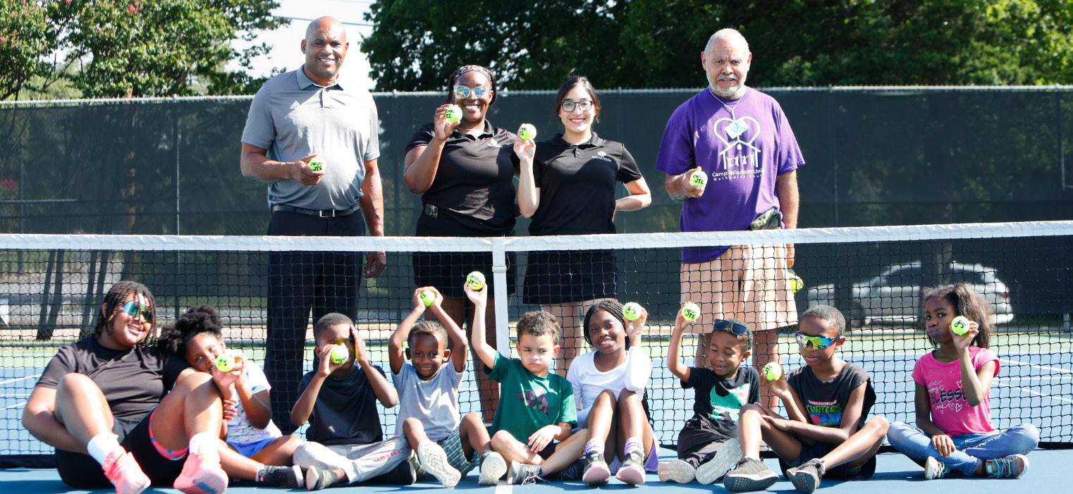 The iPlayTennis players. Second row: DISD’s AAD Aaron Wallace, Kiest Tennis Center Coach Jandiya and Coach Sara, and Co-chair Berry.