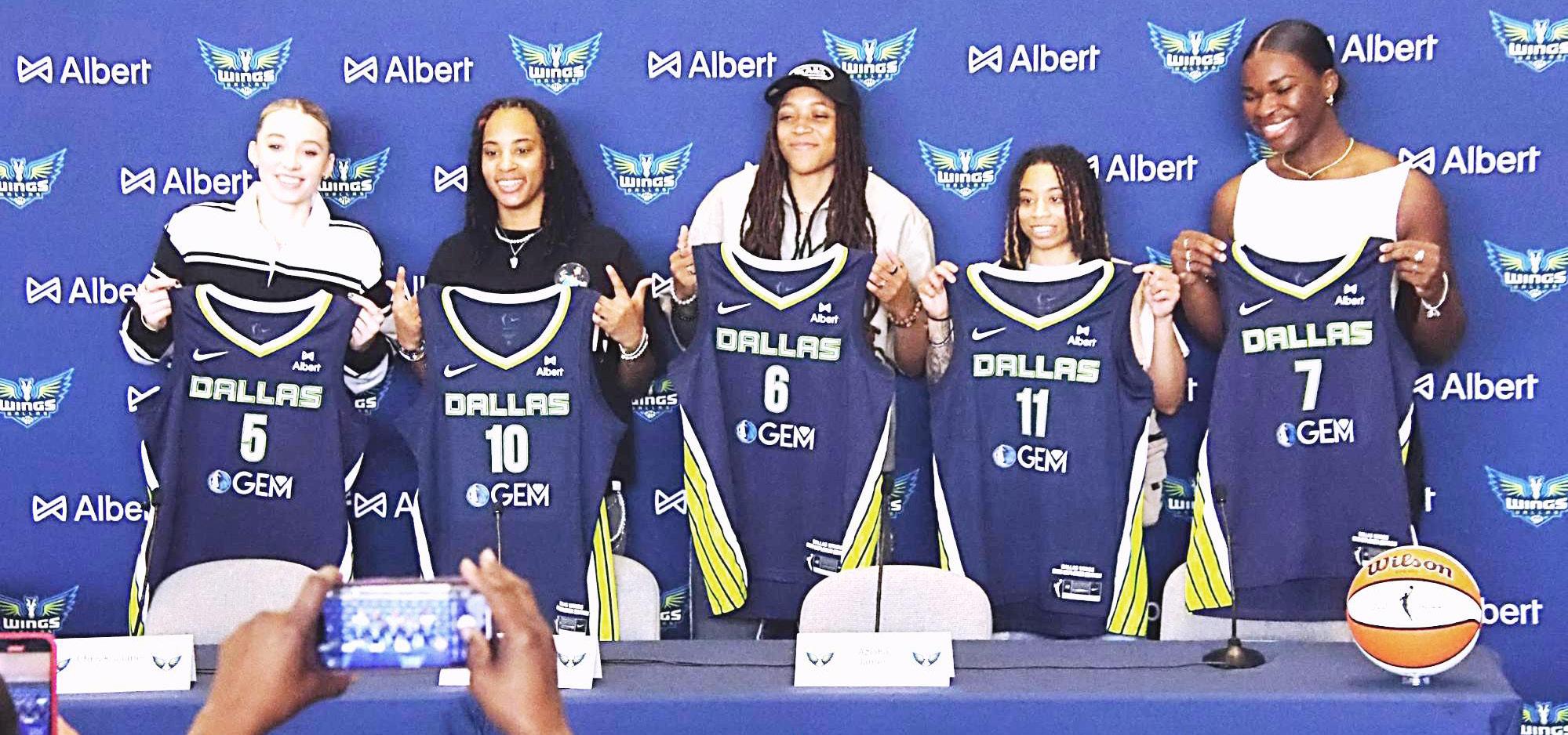 (Left to right) During the introductory press conference, Paige Bueckers, Aziaha James, Madison Scott, JJ Quinerly, and Aaronette Vonleh hold their jerseys as the newest members of the Dallas Wings.
