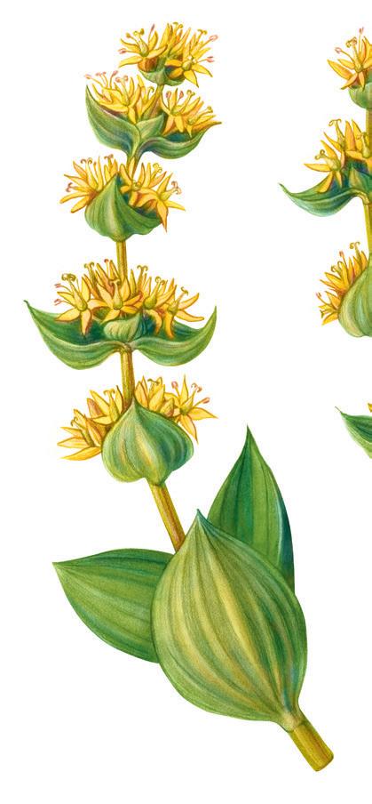 Der Gelbe Enzian ist in den Alpen und im Jura zu Hause. Er bevorzugt kalkhaltige Böden auf Weiden bis auf eine Höhe von 2500 Metern über Meer, blüht erstmals nach zehn Jahren und kann bis zu 60 Jahre alt werden. Die Hauptwurzel von älteren Pflanzen enthält die stärksten Bitterstoffe, die wir in unserer Umgebung bei Pflanzen kennen. Diese Bitterstoffe helfen mit, die Verdauungssäfte zu stimulieren, um deftige Speisen besser verdauen zu können. Früher wurden diese auch bei psychischen Problemen angewendet, denn sie können buchstäblich beim Verarbeiten von Prozessen helfen. Der Gelbe Enzian ist ein wunderbarer Begleiter, wenn einem «etwas auf dem Magen liegt».