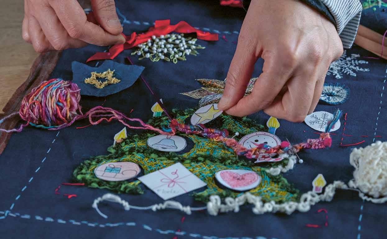 Mittendrin im Arbeitsprozess: Heimische sowie asiatische Materialien kombiniert mit verschiedenen Techniken ergeben das aktuelle Weihnachtssujet.