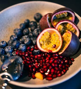 Byggrynsgrøt toppet med nøtter, honning, bær og masse digg frukt.