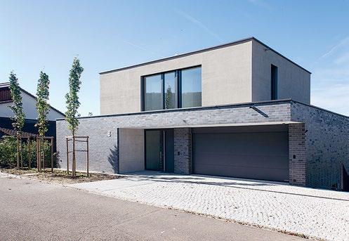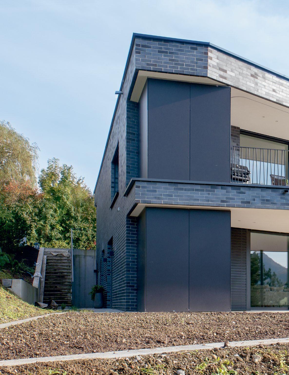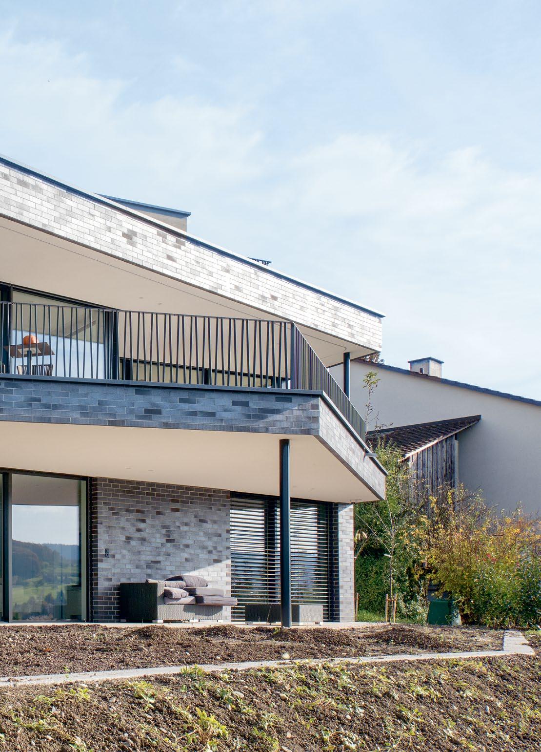 Ein «modernes Haus mit viel Glas, Flachdach und Klinkerfassade» wünschten sich die Bauherren. Im vorderen Hausbereich (Westen) liessen sie grosse Glasfronten errichten, eingefasst in Mauerwerke, die mit 12 mm dicken Klinkerriemchen aus der Ziegelei in Frick bestückt sind. Das während des Brennprozesses eingespritzte Öl verleiht dem Klinker einen leichten Glanz und lässt ihn je nach Sonneneinstrahlung in verschiedenen Farbtönen erstrahlen, von grau-braun bis anthrazit-metallic. Besonders stark prägen die Ziegel das Fassadenbild auf der strassenzugewandten Seite, wo die Fensteröffnungen kleiner sind. Im Kontrast dazu wurde das Attika mit einem ruhigen Abrieb in «Besenstrich»-Optik versehen.