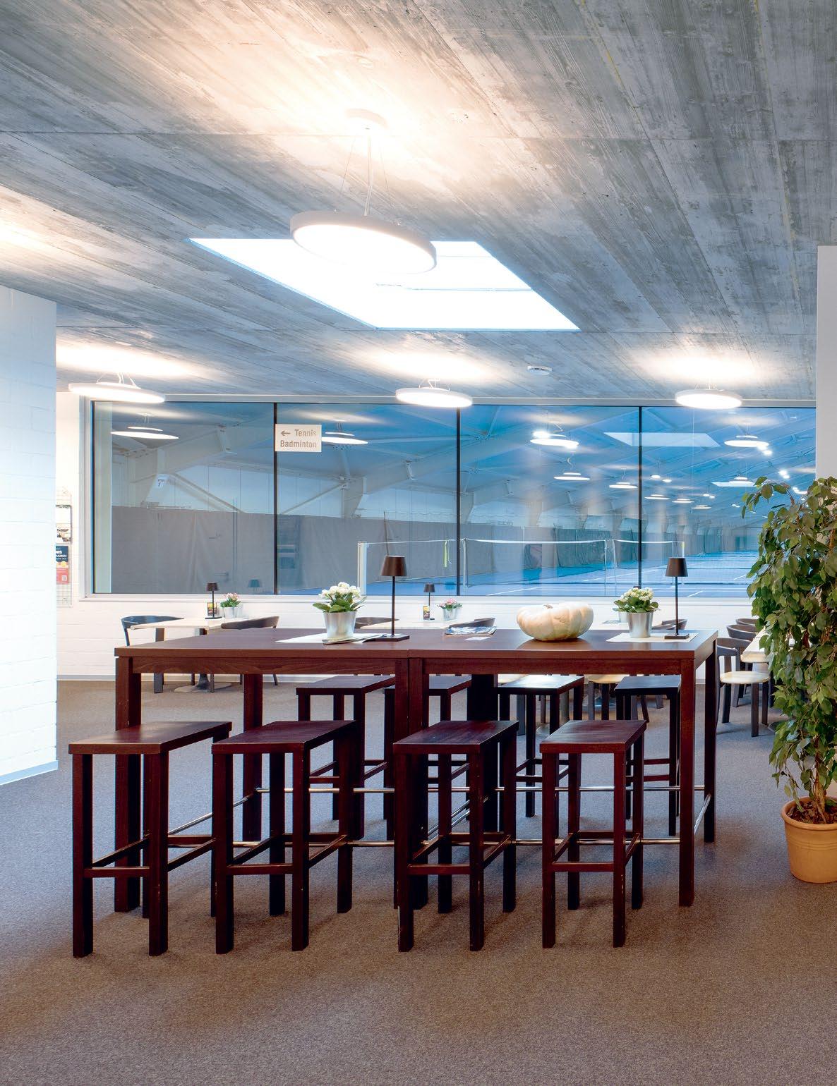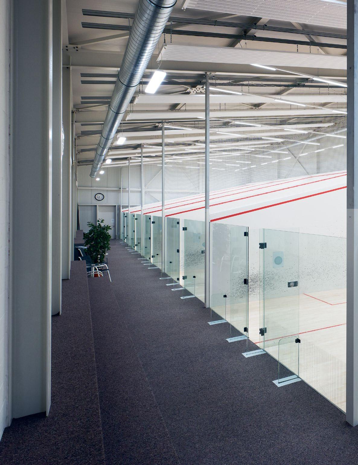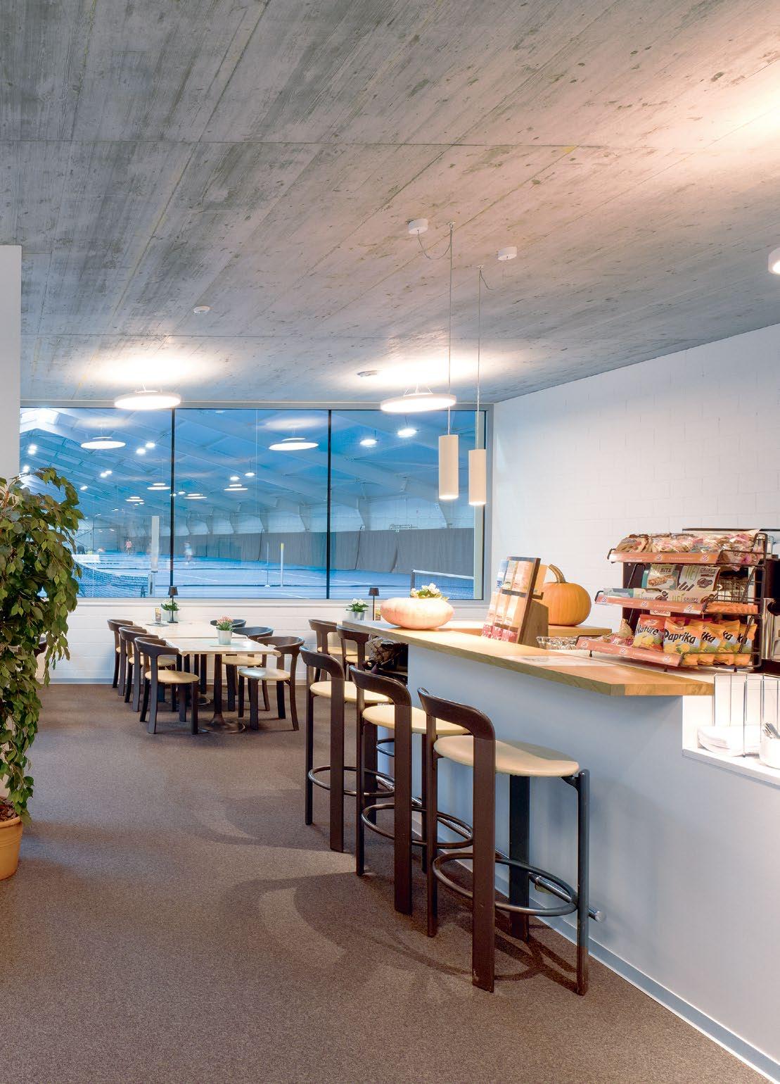 Das Anlagegefüge setzt sich aus drei Volumen zusammen: aus einer Tennis- und einer Squashhalle und einem Mitteltrakt. Die Tennishalle ist mit einem Steildach ausgebildet und umfasst sieben Plätze, die auch Einrichtungen für den Badminton/Pickleball-Betrieb enthalten. Sie überragt die Squashhalle mit Pultdach. In dieser etwas kleineren Halle stehen sechs Plätze zur Verfügung. Sie bildet den westlichen Abschluss des langgezogenen Gebäudekomplexes, an den die grosse baumbewachsene Parkplatzfläche mit 57 Parkfeldern anschliesst. Im selben Volumen ist auch ein Fitnessbereich und eine Physiopraxis untergebracht. Zwischen den beiden Hallen funktioniert der massive, mit extensiv begrüntem Flachdach und integrierten Lichtkuppeln ausgestattete Mitteltrakt als Scharnier. Er dient dem Empfang und dem Aufenthalt, umfasst Büro-, Garderoben-, Toiletten- und Lagerräume, den Technikraum sowie ein SportBistro. Selbst ein eigener Shop inklusive Bespannungsservice ist vorhanden. Die Energieversorgung des Sportcenters wird mit einer Photovoltaikanlage auf dem Dach abgedeckt. Rund zehn Prozent des Solarstroms werden voraussichtlich für den Betrieb der Sportanlage benötigt, der Rest wird ins allgemeine Netz eingespeist. Über eine Fussbodenheizung mit Umkehrsystem können die Hallen im Winter geheizt und im Sommer gekühlt werden.