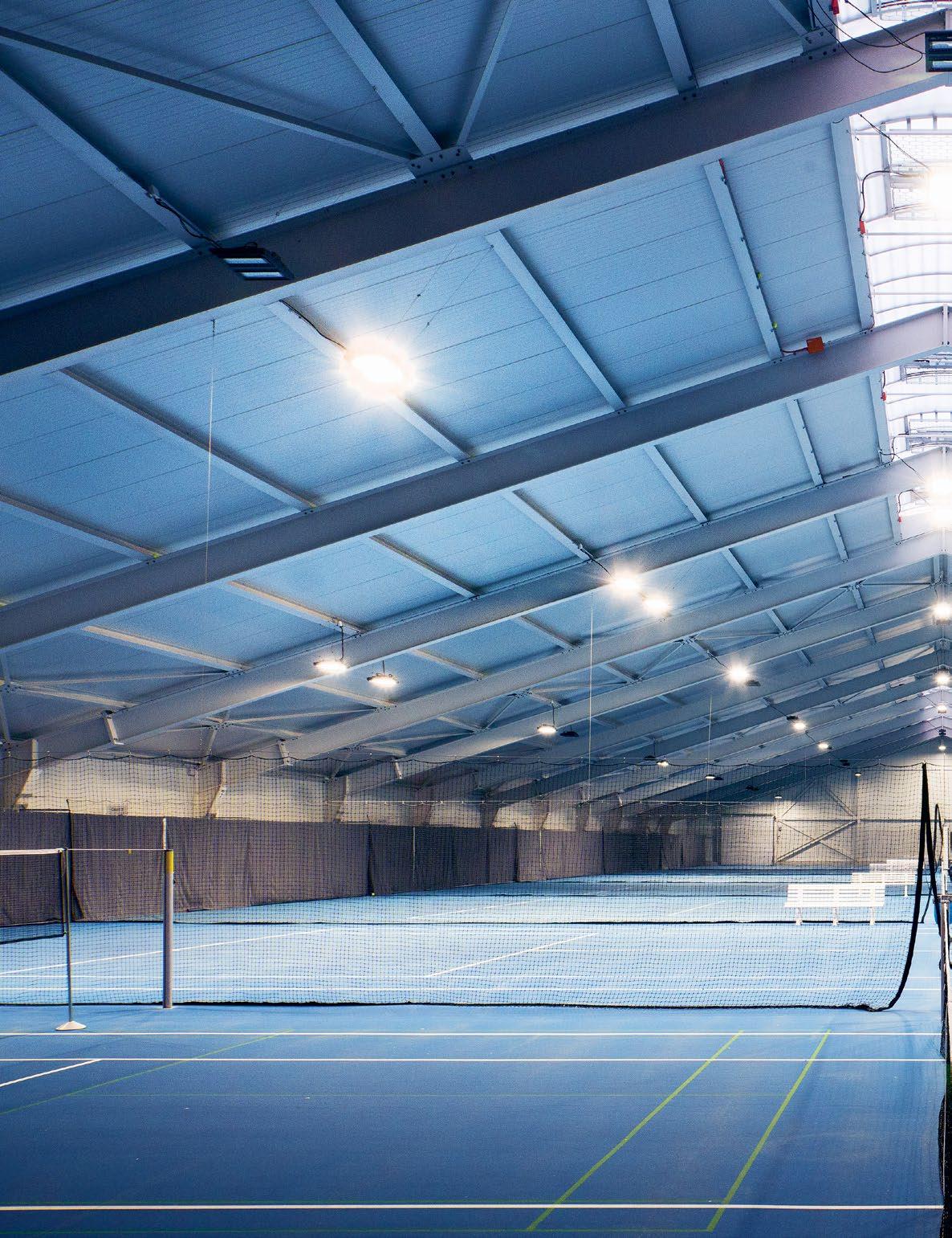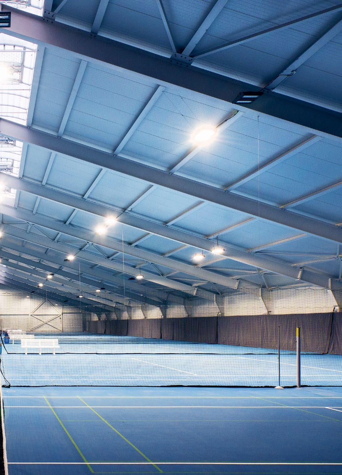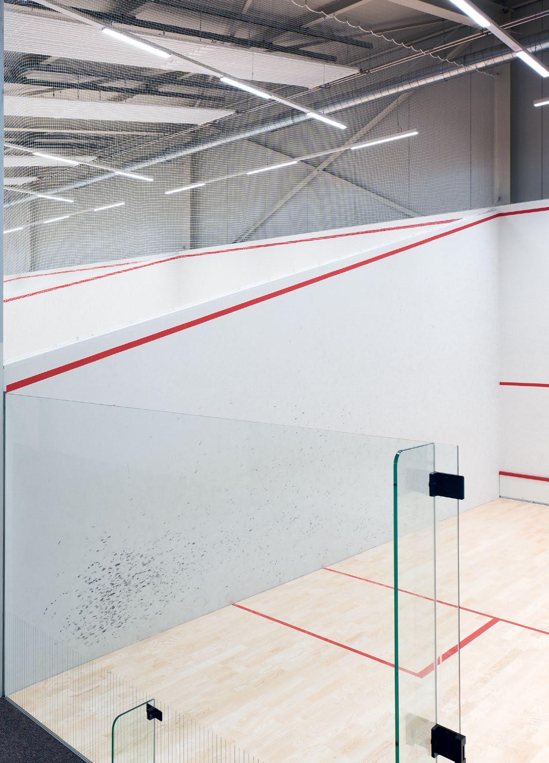 Das Anlagegefüge setzt sich aus drei Volumen zusammen: aus einer Tennis- und einer Squashhalle und einem Mitteltrakt. Die Tennishalle ist mit einem Steildach ausgebildet und umfasst sieben Plätze, die auch Einrichtungen für den Badminton/Pickleball-Betrieb enthalten. Sie überragt die Squashhalle mit Pultdach. In dieser etwas kleineren Halle stehen sechs Plätze zur Verfügung. Sie bildet den westlichen Abschluss des langgezogenen Gebäudekomplexes, an den die grosse baumbewachsene Parkplatzfläche mit 57 Parkfeldern anschliesst. Im selben Volumen ist auch ein Fitnessbereich und eine Physiopraxis untergebracht. Zwischen den beiden Hallen funktioniert der massive, mit extensiv begrüntem Flachdach und integrierten Lichtkuppeln ausgestattete Mitteltrakt als Scharnier. Er dient dem Empfang und dem Aufenthalt, umfasst Büro-, Garderoben-, Toiletten- und Lagerräume, den Technikraum sowie ein SportBistro. Selbst ein eigener Shop inklusive Bespannungsservice ist vorhanden. Die Energieversorgung des Sportcenters wird mit einer Photovoltaikanlage auf dem Dach abgedeckt. Rund zehn Prozent des Solarstroms werden voraussichtlich für den Betrieb der Sportanlage benötigt, der Rest wird ins allgemeine Netz eingespeist. Über eine Fussbodenheizung mit Umkehrsystem können die Hallen im Winter geheizt und im Sommer gekühlt werden.