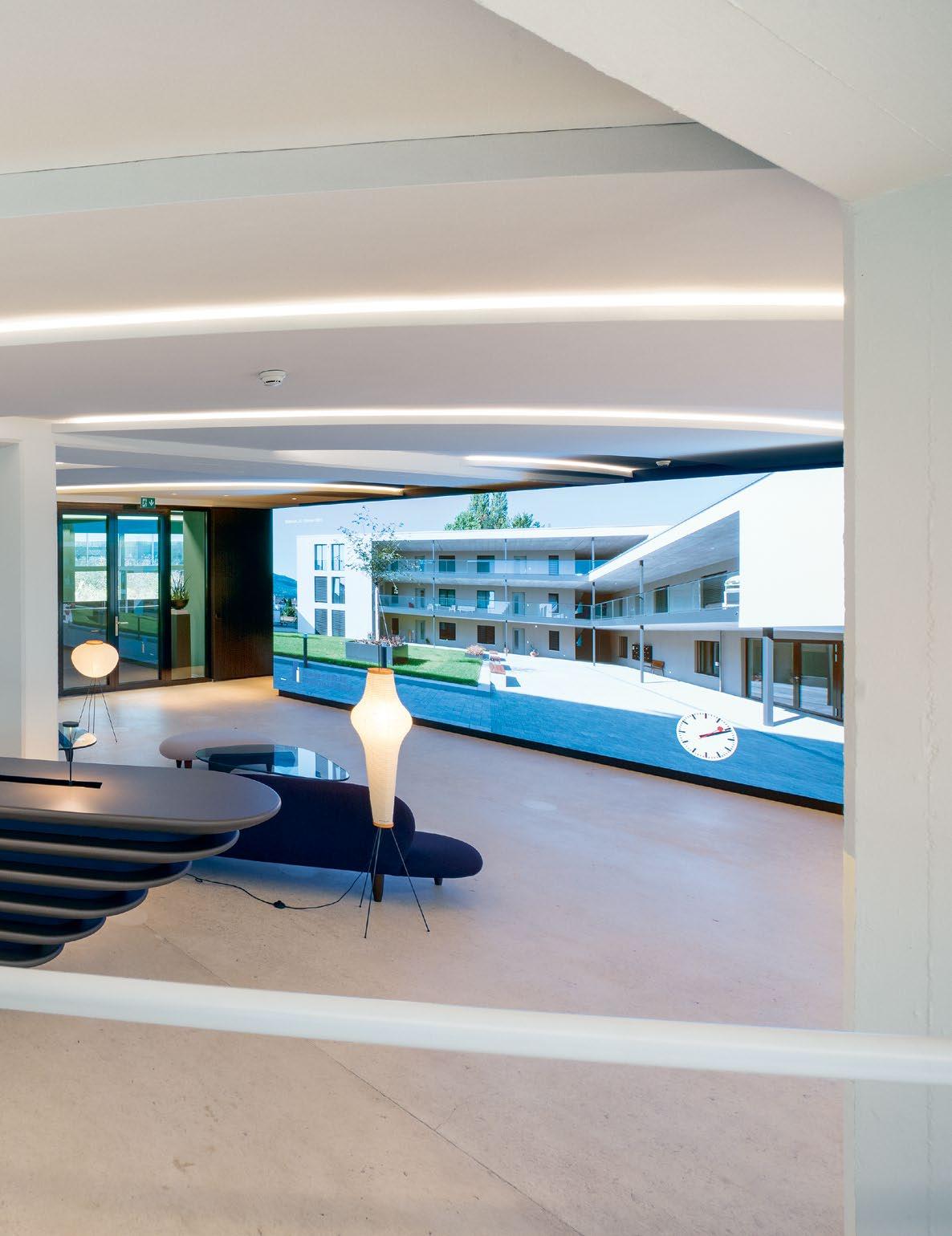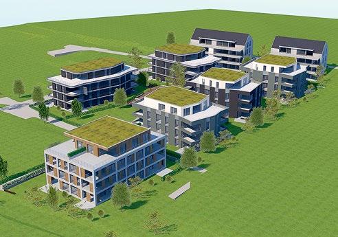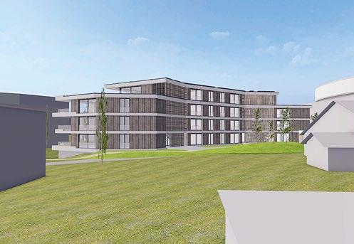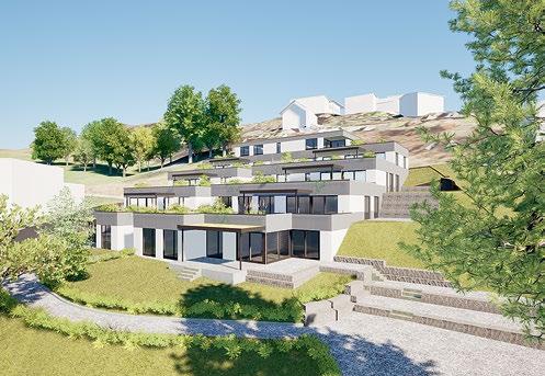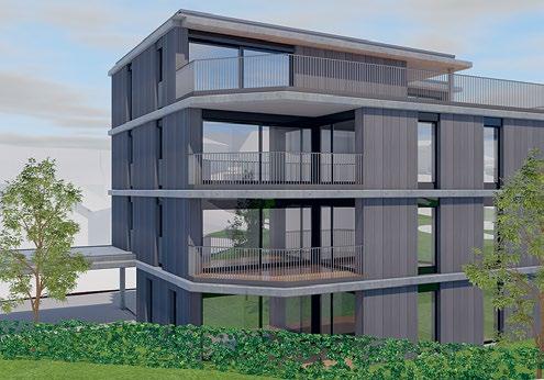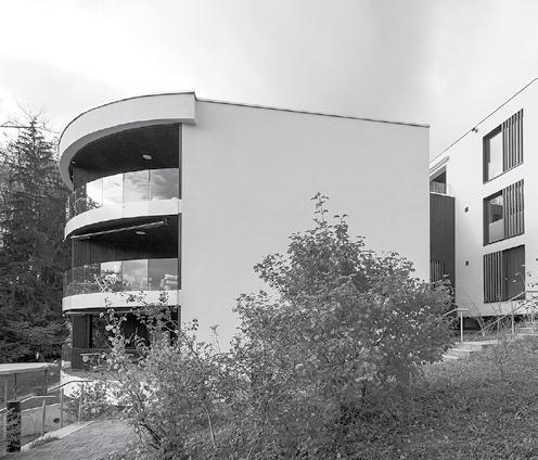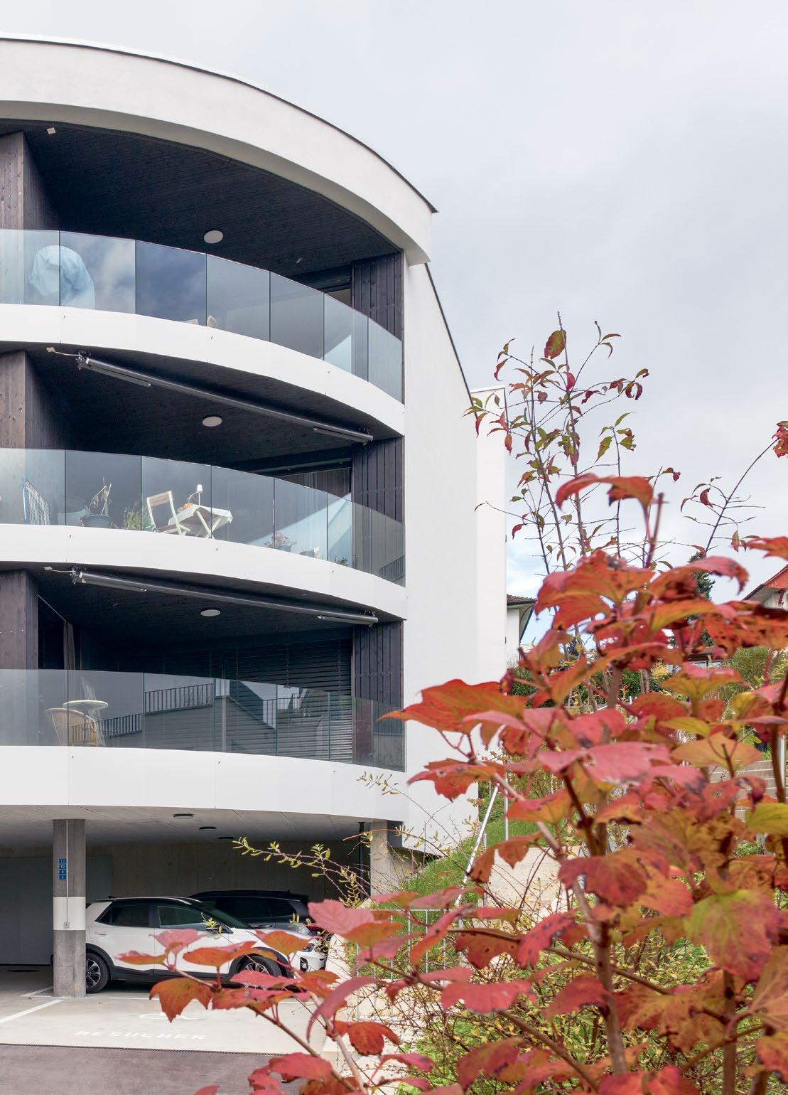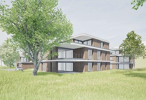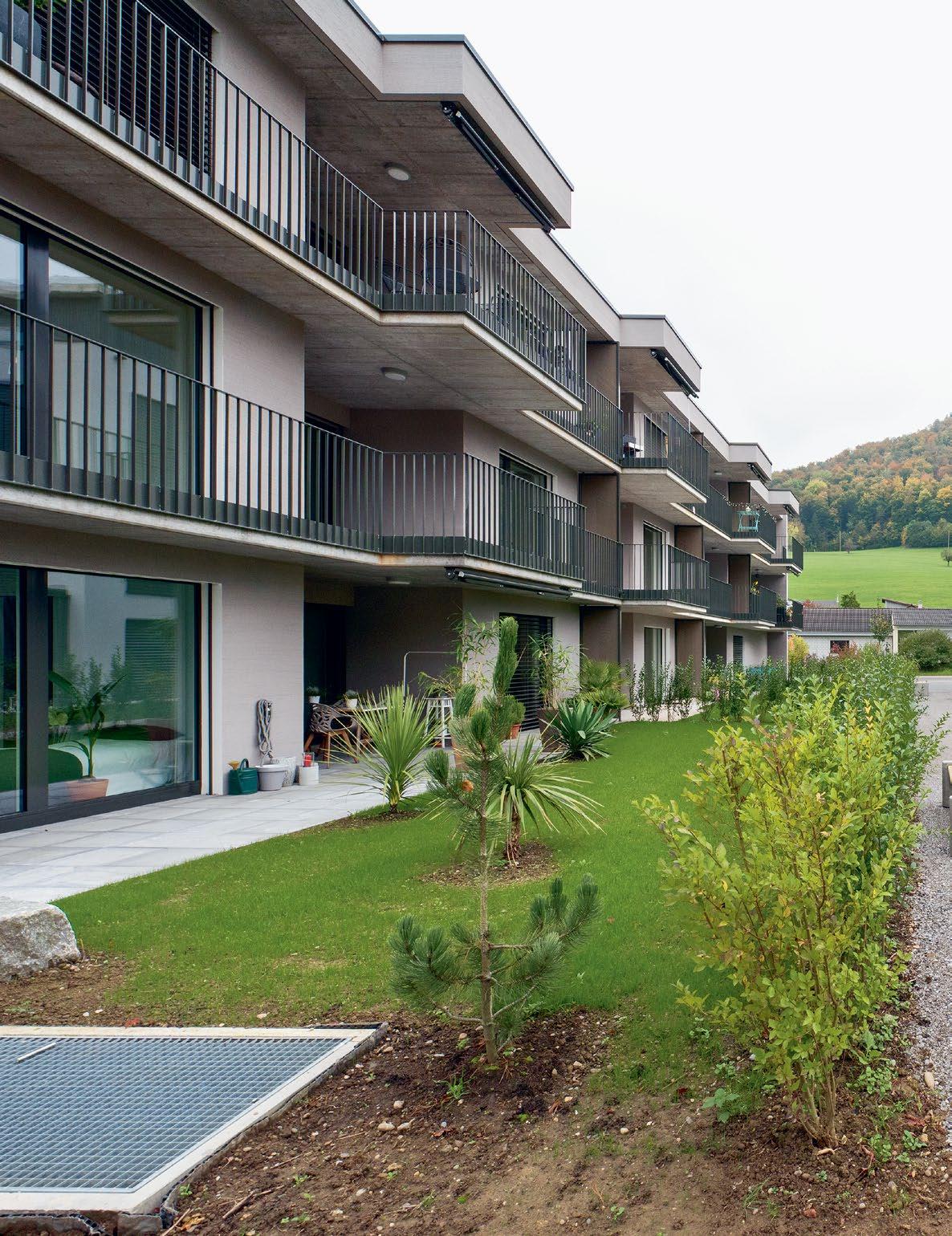 In diesem sorgfältig ausgestalteten Gesamtgebilde setzt sich die Wohnlandschaft aus unterschiedlichen Layouts zusammen, die alle über wertvolle Qualitäten verfügen: viel Licht, offene Tagesbereiche mit Wohnen, Essen und Küche, gedeckte Balkone, gut möblierbare Räume und raumhohe Fensterfronten, begehbare Kleiderschränke und eine individuell steuerbare Komfortlüftung. Hinzu kommen behutsam integrierte Sichtverbindungen in die Umgebung, ins angrenzende Wäldchen und den neu angelegten Garten mit Spielund Gemeinschaftsfläche im Süden der Parzelle. Unter diesem ist von der grossen Einstellhalle (15 Stellplätze) jede Wohnung bequem und rollstuhlgängig mit dem Lift erreichbar. Über die seitlich geschwungene Treppen anlage erreicht man den Lichthof des Hauses. Die Überbauung ist mit ihren parallelverlaufenden Aussenwegen, begleitenden Stützmauern und einheimischem Wildgehölz gut gegen die Strasse im Nordwesten und die benachbarte Überbauung «Alte Gärtnerei» im Nordwesten abgeschirmt.