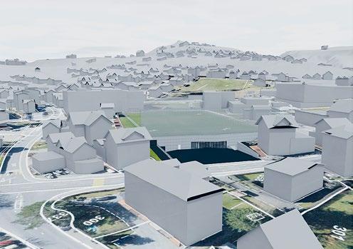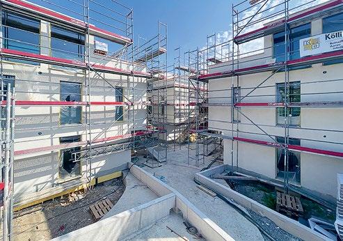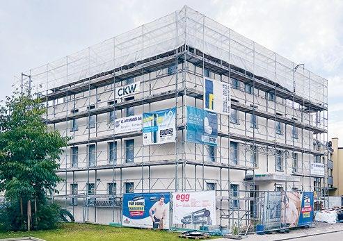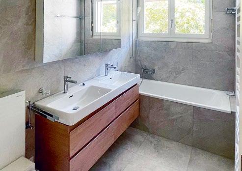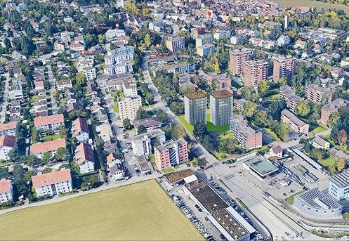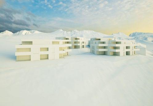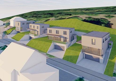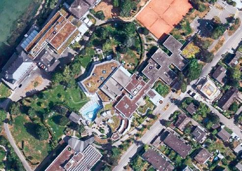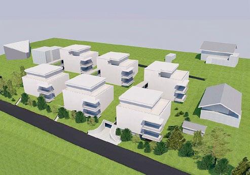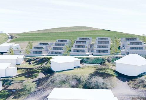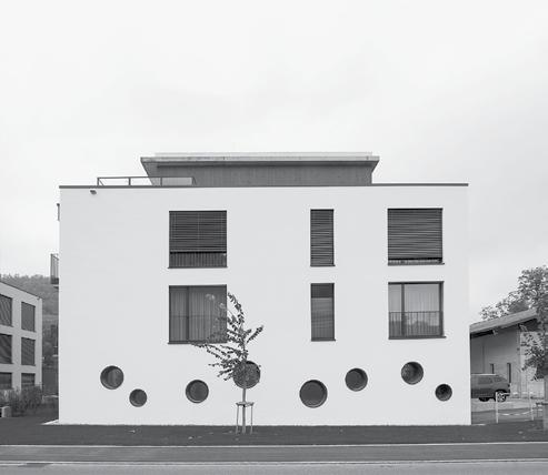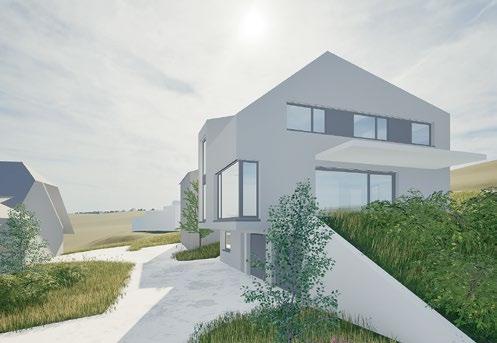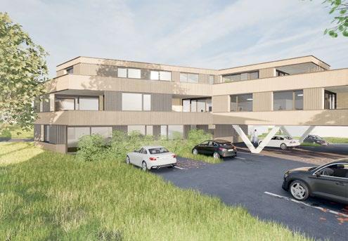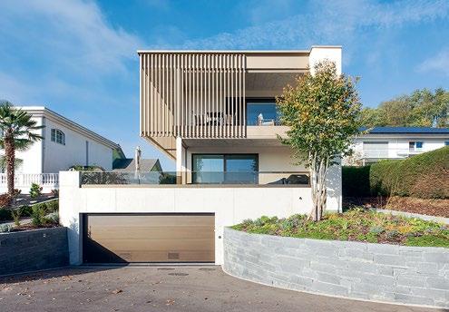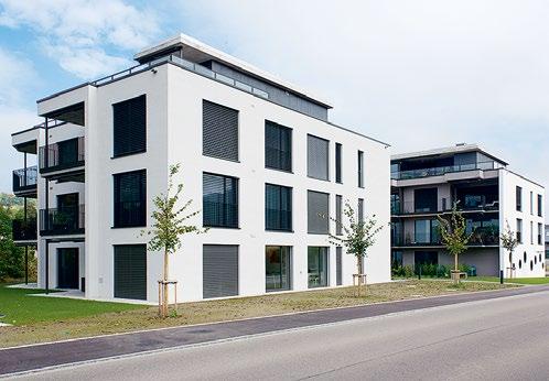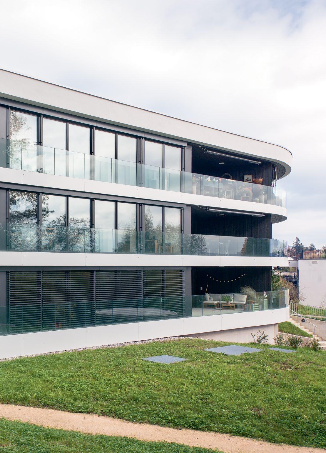 In diesem sorgfältig ausgestalteten Gesamtgebilde setzt sich die Wohnlandschaft aus unterschiedlichen Layouts zusammen, die alle über wertvolle Qualitäten verfügen: viel Licht, offene Tagesbereiche mit Wohnen, Essen und Küche, gedeckte Balkone, gut möblierbare Räume und raumhohe Fensterfronten, begehbare Kleiderschränke und eine individuell steuerbare Komfortlüftung. Hinzu kommen behutsam integrierte Sichtverbindungen in die Umgebung, ins angrenzende Wäldchen und den neu angelegten Garten mit Spielund Gemeinschaftsfläche im Süden der Parzelle. Unter diesem ist von der grossen Einstellhalle (15 Stellplätze) jede Wohnung bequem und rollstuhlgängig mit dem Lift erreichbar. Über die seitlich geschwungene Treppen anlage erreicht man den Lichthof des Hauses. Die Überbauung ist mit ihren parallelverlaufenden Aussenwegen, begleitenden Stützmauern und einheimischem Wildgehölz gut gegen die Strasse im Nordwesten und die benachbarte Überbauung «Alte Gärtnerei» im Nordwesten abgeschirmt.