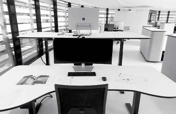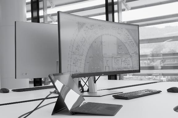 Fast alle unsere Mitarbeitenden verfügen über ein Tablet, das ihnen ermöglicht, sich jederzeit an einem anderen Arbeitsplatz, in den Besprechungsboxen oder in Sitzungszimmern ins Firmen-Netzwerk einzuloggen. In diesem finden sich alle Unterlagen des Unternehmens in digitaler Form – von Rechnungen über Devis und Plänen bis zu persönlichen Notizen. Die Tablets lassen sich auch ganz einfach mit grösseren Bildschirmen in den Besprechungsboxen und den beiden Sitzungszimmern oder mit dem LED-Screen in der «Arena» verbinden, so dass an einer Sitzung oder Präsentation alle Teilnehmenden sehen, was auf dem Tablet abgerufen oder bearbeitet wird. Dieses System ist superkomfortabel und eine grosse Hilfe für alle. Einzig unsere CAD-Zeichnerinnen und -zeichner verfügen neben den Teamtablets noch über Desktop-Rechner: Das Datenvolumen in den CAD-Programmen ist für die Tablets zu gross.