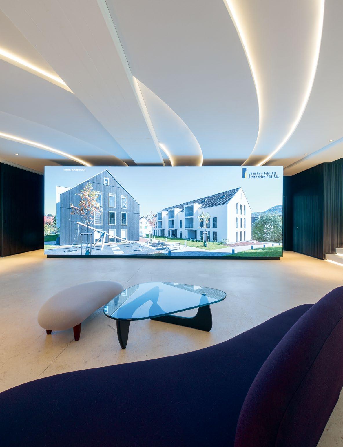 Das neue, digitalisierte Büro verfügt über zwei imposante LED-Bildschirme: Der grössere der beiden (7.2 m lang, 2.7 m hoch) wird hauptsächlich als «digitaler Bilderrahmen» genutzt: Darauf werden beispielsweise inspirierende Fotografien gezeigt, Geburtstagswünsche an Mitarbeitende oder Willkommensgrüsse an Gäste. Der etwas kleinere Bildschirm (4.2 m lang, 2.4 m hoch) ist in der «Arena» platziert: Er wird für Präsentationen und Schulungen genutzt. Auch die beiden Sitzungszimmer verfügen über Grossbildschirme. Diese lassen sich ganz einfach und drahtlos über Tablets ansteuern. Fast alle Mitarbeitenden sind mit solchen Tablets ausgerüstet und können sich damit an einem x-beliebigen Ort ins Netzwerk einloggen, z.B. in einer Besprechungsbox, im Sitzungszimmer oder draussen im Garten. An ihrem Arbeitsplatz stehen ihnen zudem ein Bildschirm und eine Tastatur zur Verfügung.
